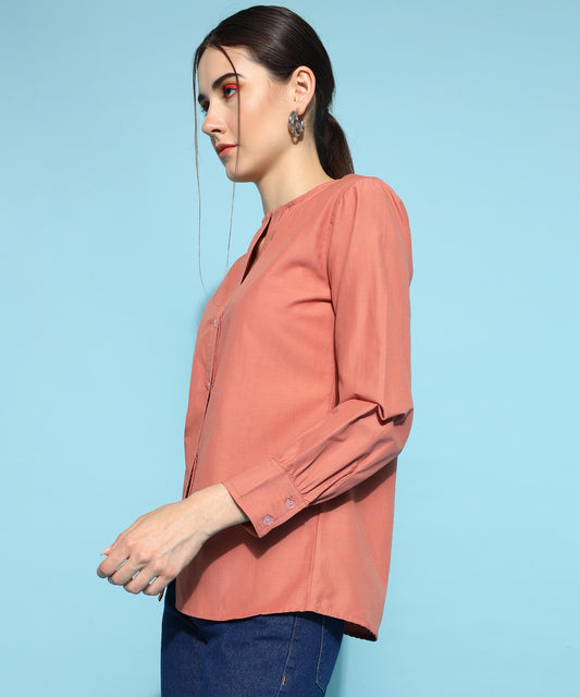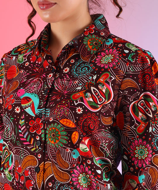 Printed Women's Casual Shirt - Stylish Floral Print, Regular Fit,Comfortable Cotton Fabric with Puff Sleeves (Brown)
