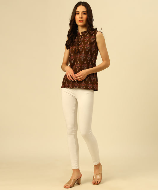 Cotton Printed Top Sleeveless Regular Fit Office Wear Casual Wear Top,Brown