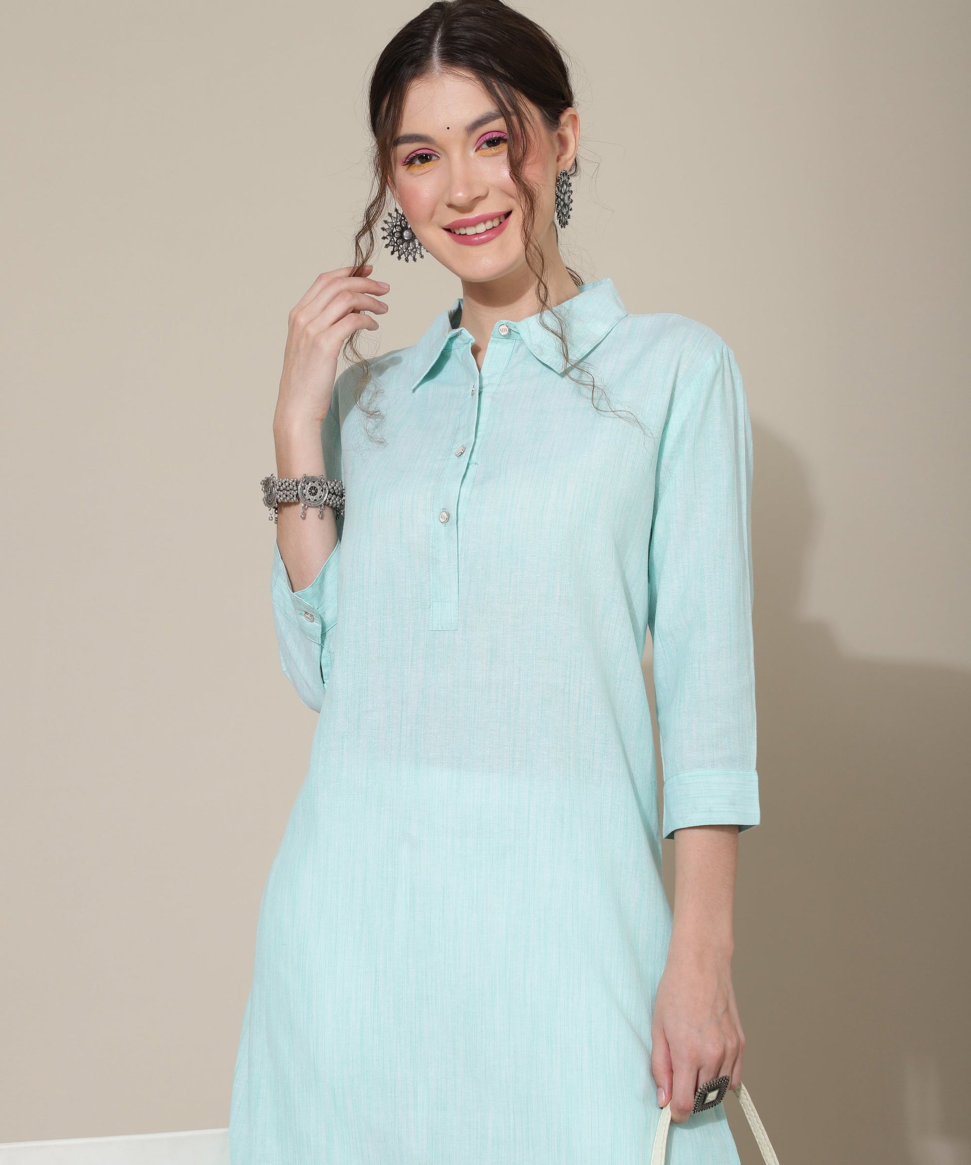 Cotton Kurta For Women Collar Design Pattern with Button Style, Blue