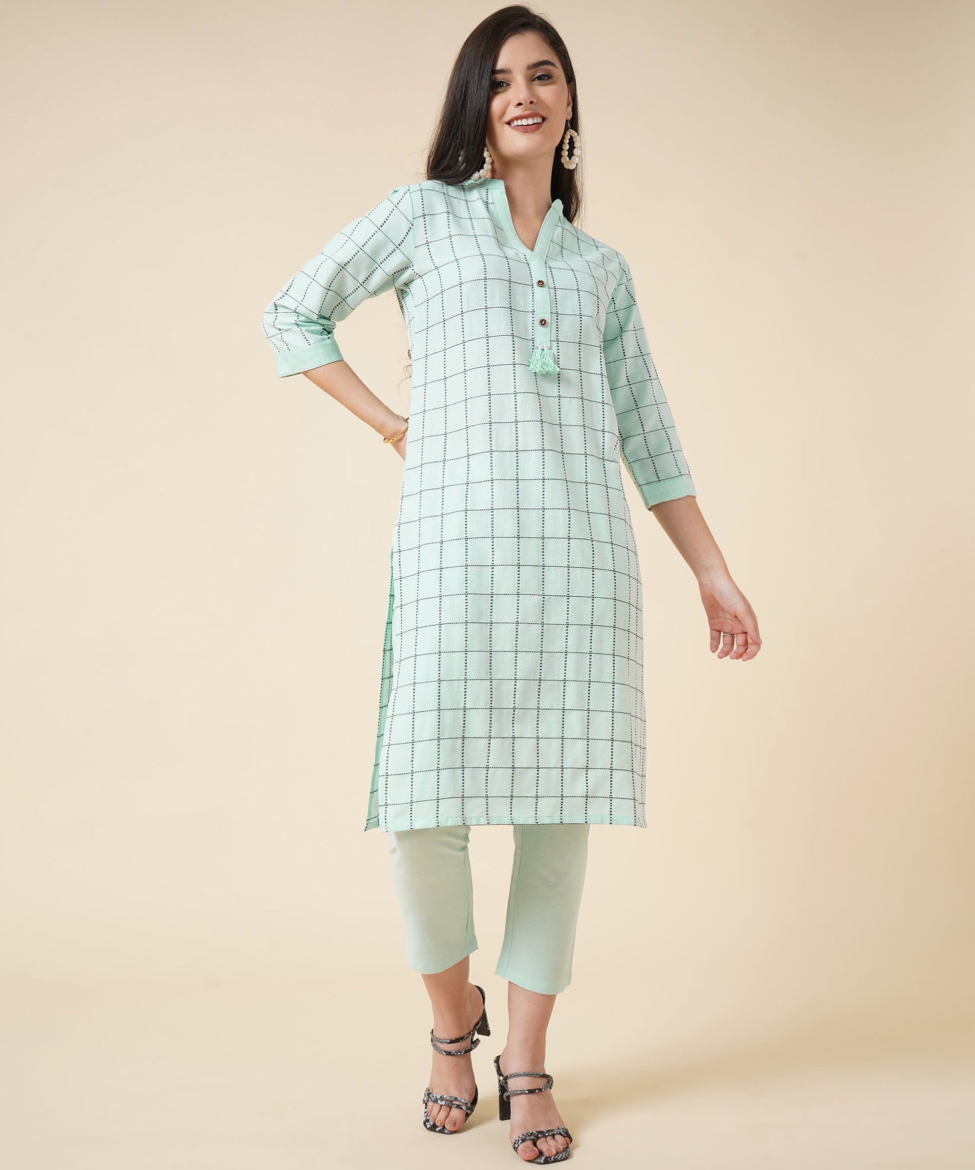 Put On This Stunning Traditional Product From The "Anushil" Hosue To Amaze Everyone With Your Stunning Traditional Look. Trendy Work & Designs Speak A Language Of Elegance And Felinity, Using Quality Fabrics And Is Trendy Fashionable As Well As Comfortable. Fine Finish And Latest Designs. It Will Be Soft For Your Skin And Lightweight. You Can Wear This Kurta Set With Pant Having Checks Design With Buttons And Tussels For Functions, Festivals, Parties, And Even Weddings To Enhance Your Beauty And Give You A Sophisticated Look. Once you wear it, you'll be the centre of attention at the event.