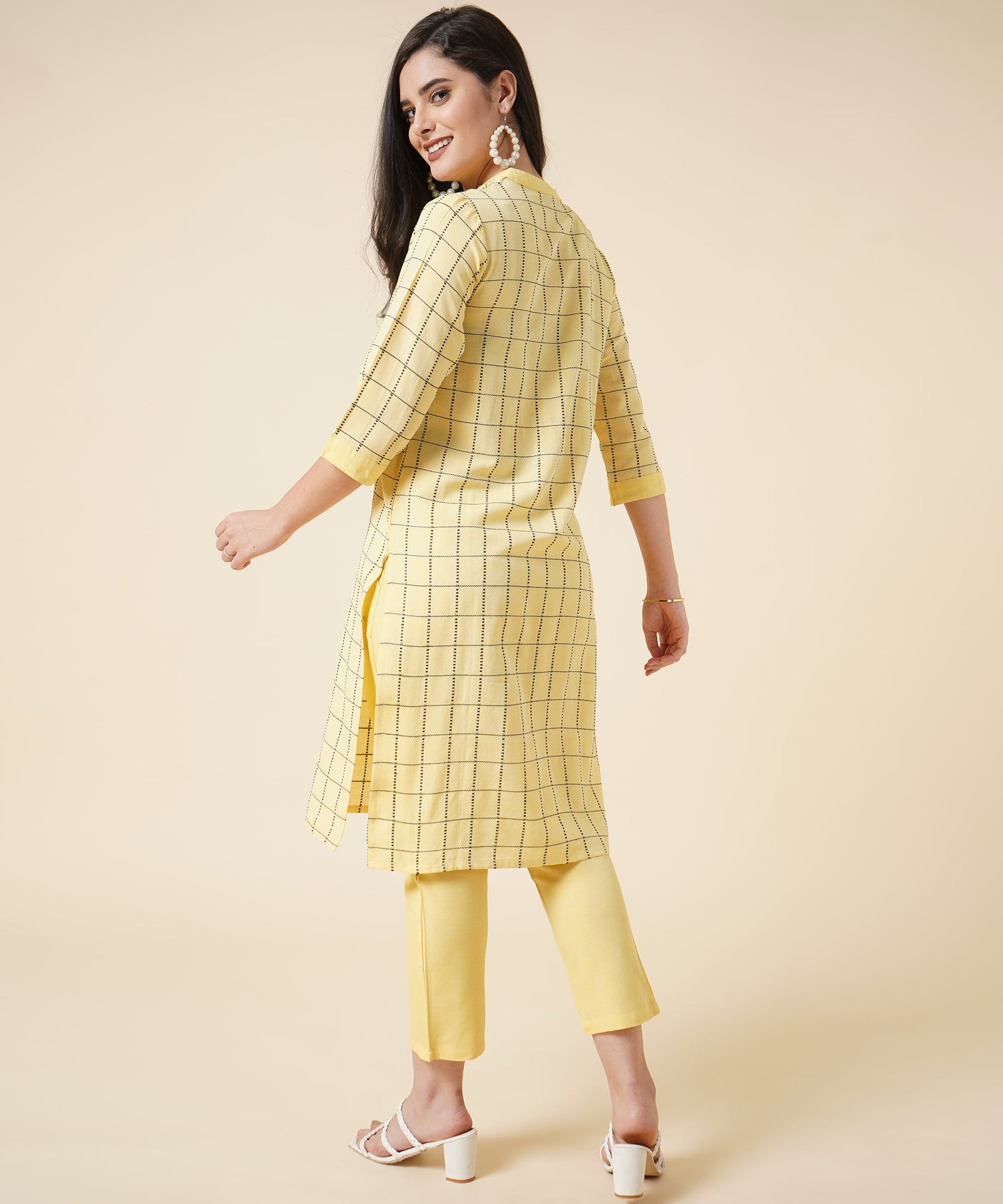 Cotton Kurta Set With Pants Check Design Pattern, Yellow