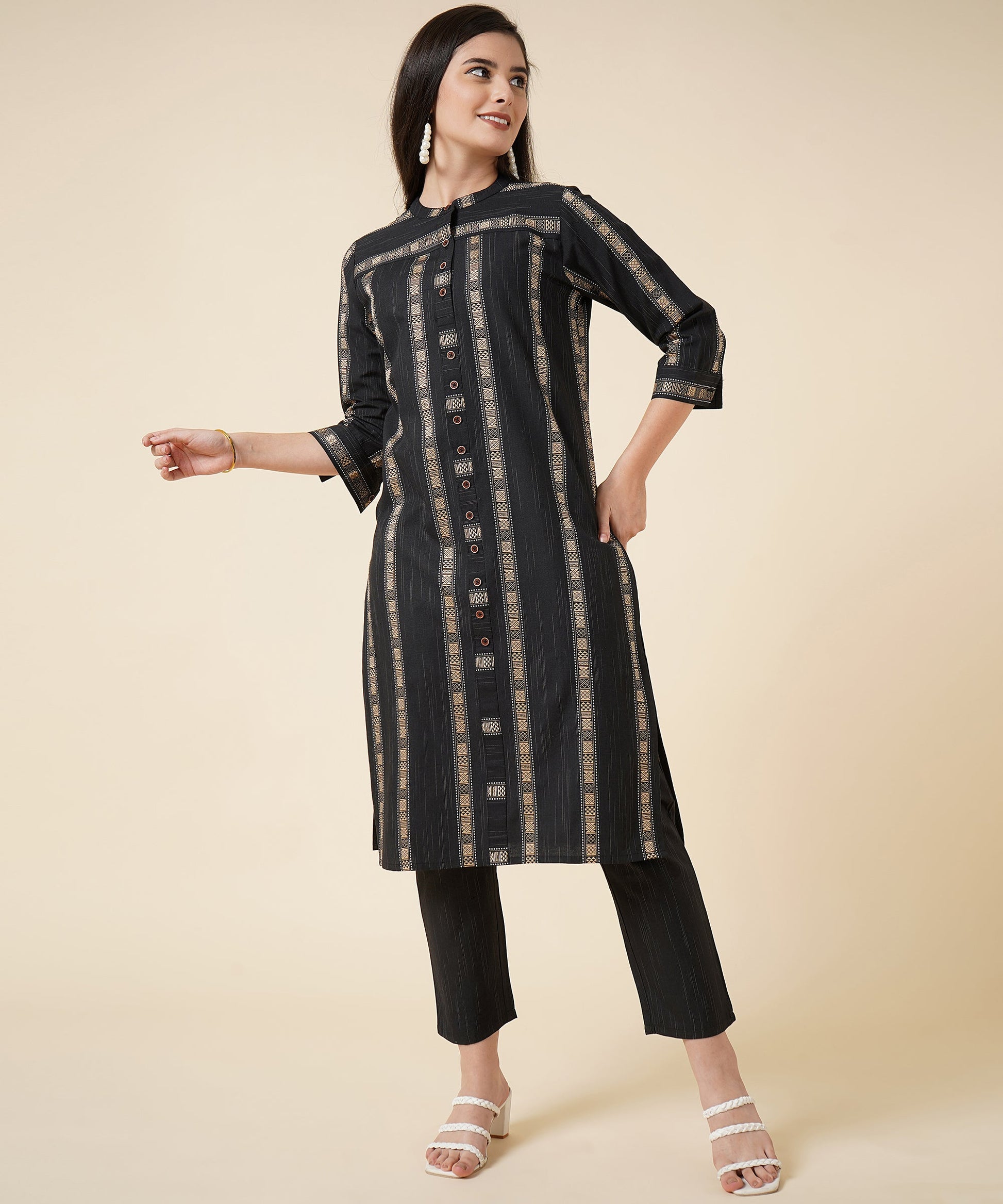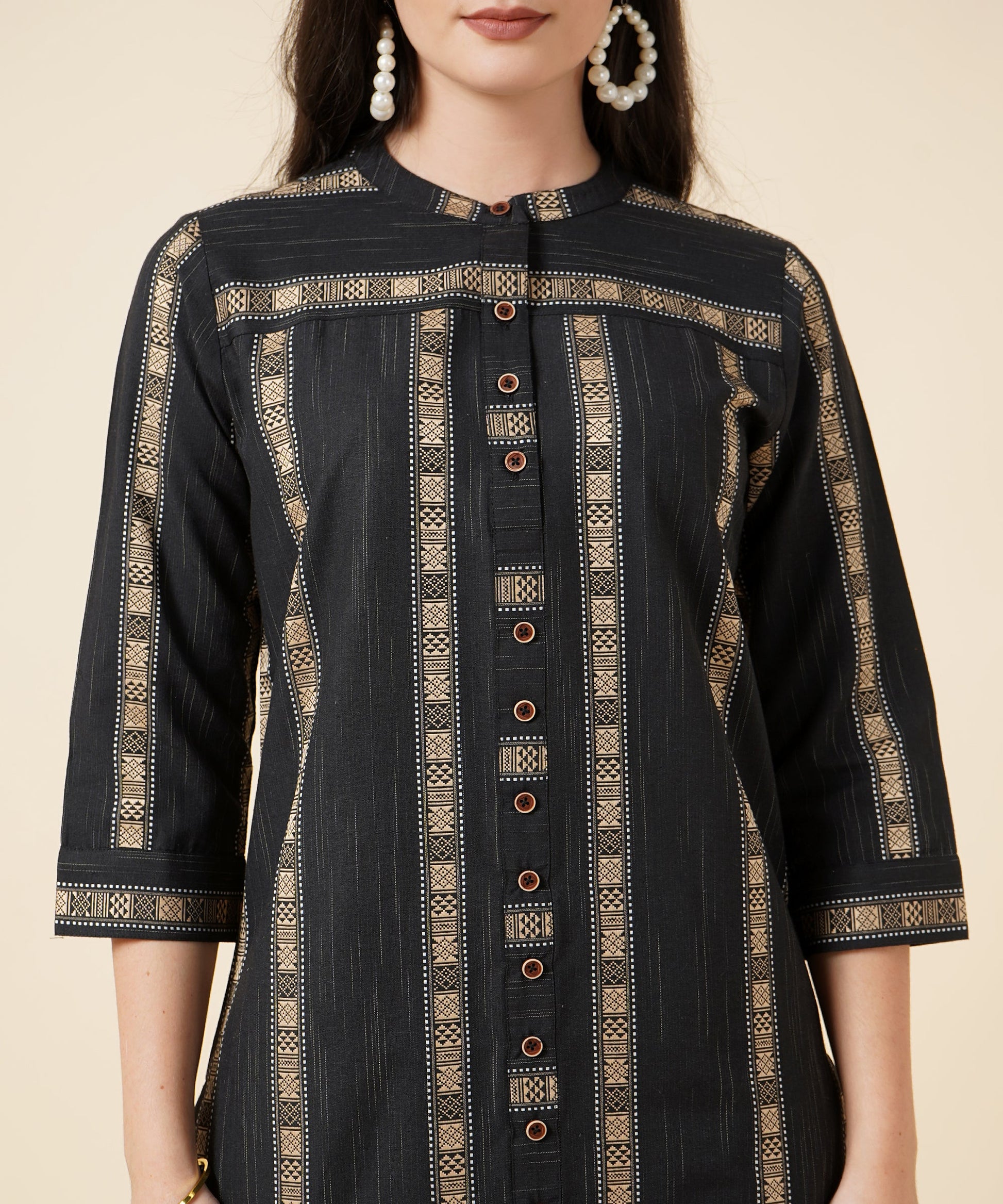 - Woven Kurti with a Roundneck, 3/4 sleeves, and calf length with fashionable buttons