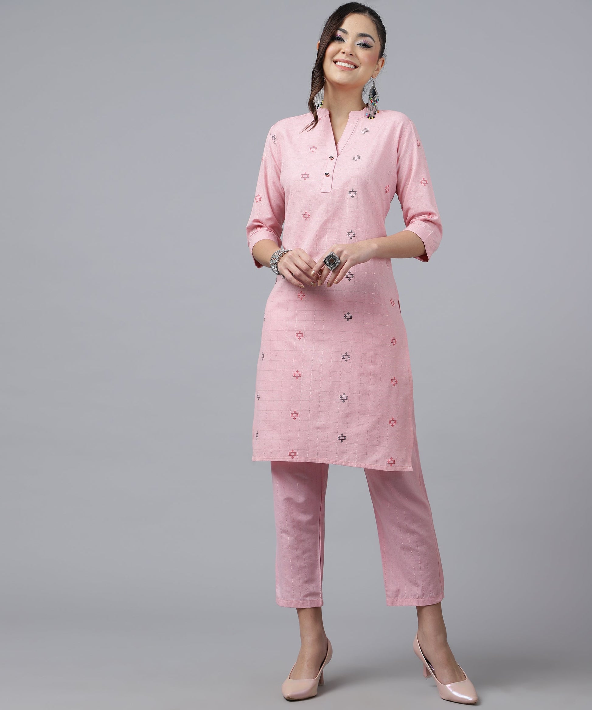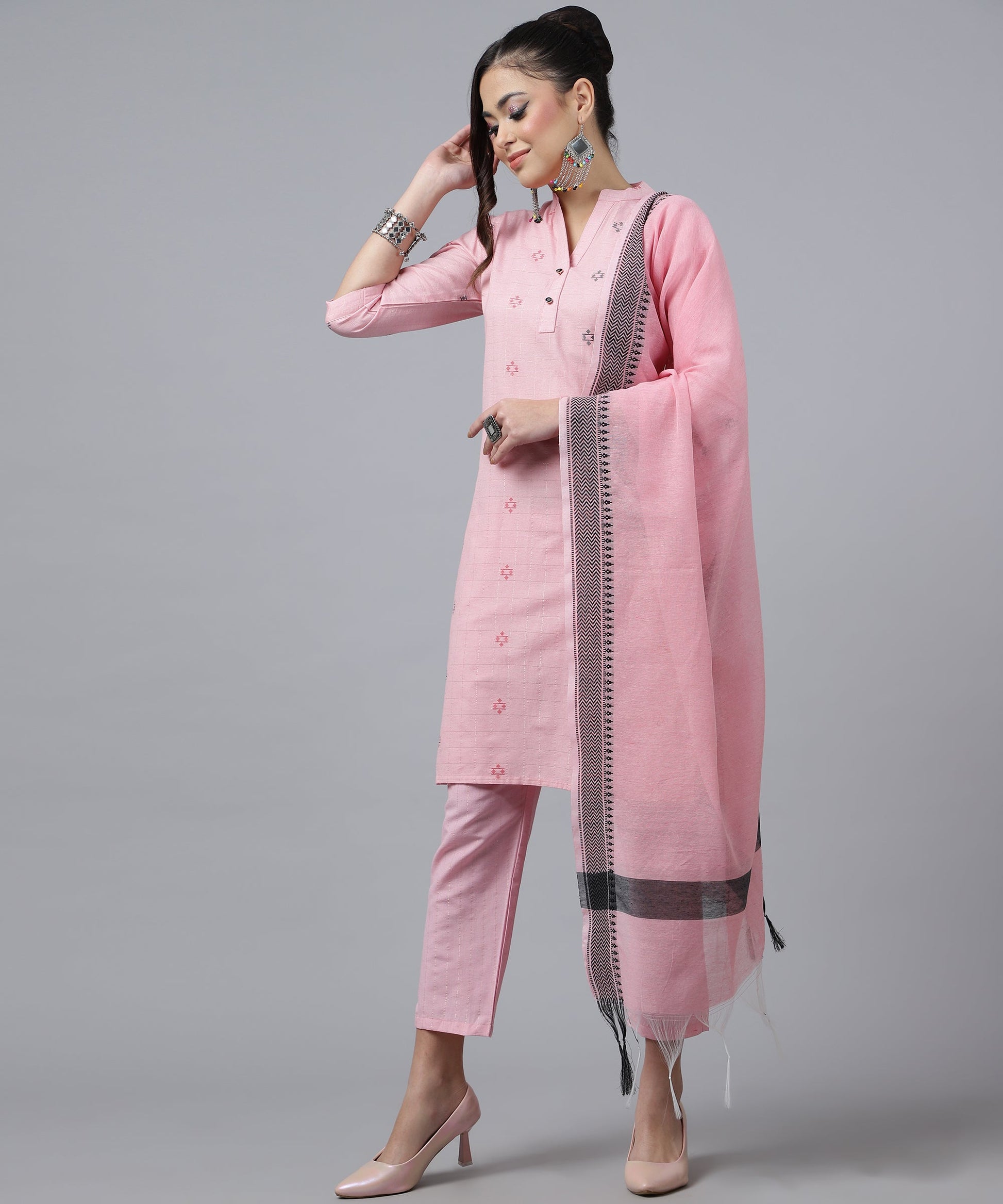 ANUSHIL Kurta Pant Set with Dupatta: Stunning V-Neck Lurex Checks and Embroidery, 3/4 Sleeves, Self-Design Pocket, Cotton Fabric(Pink)