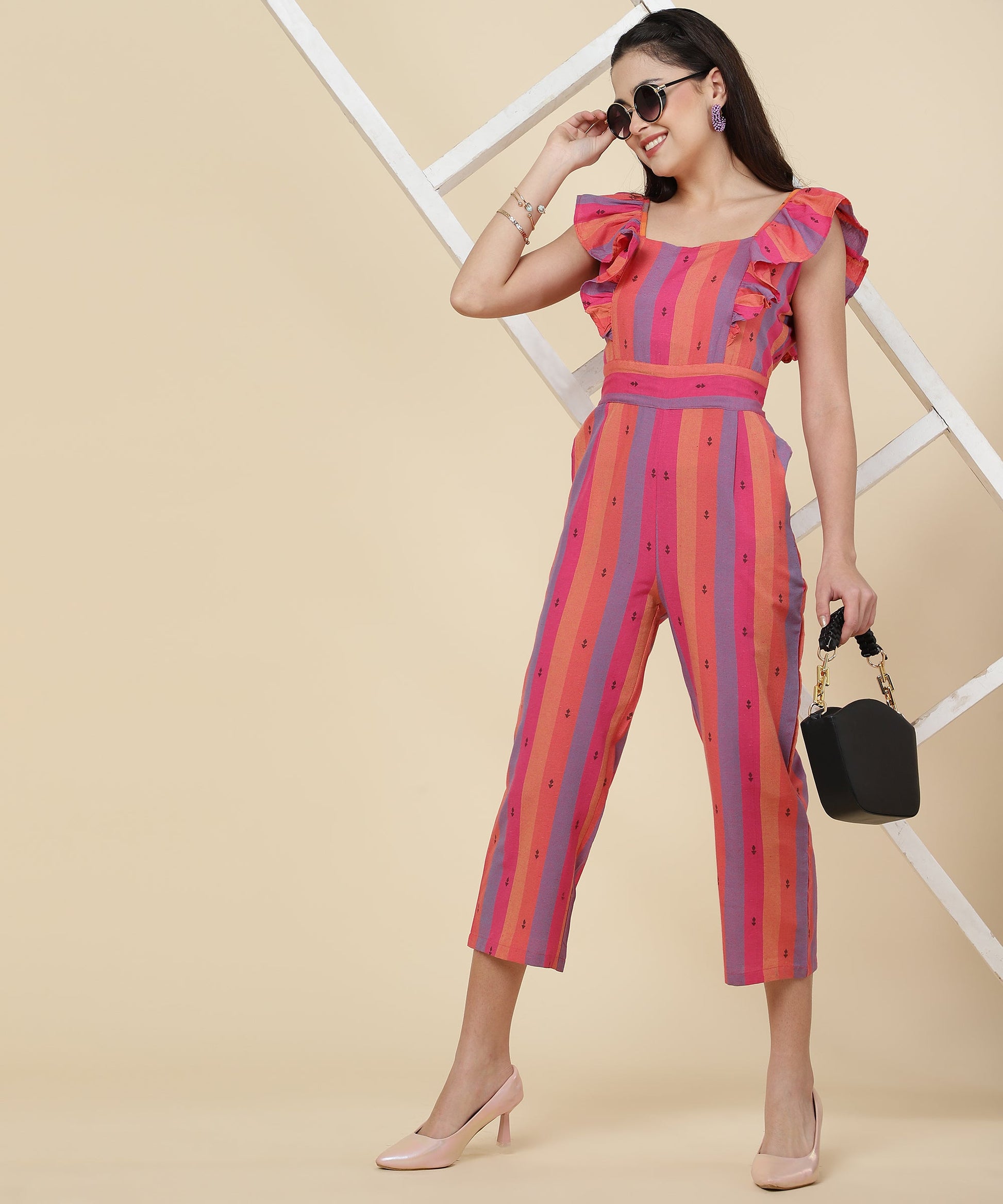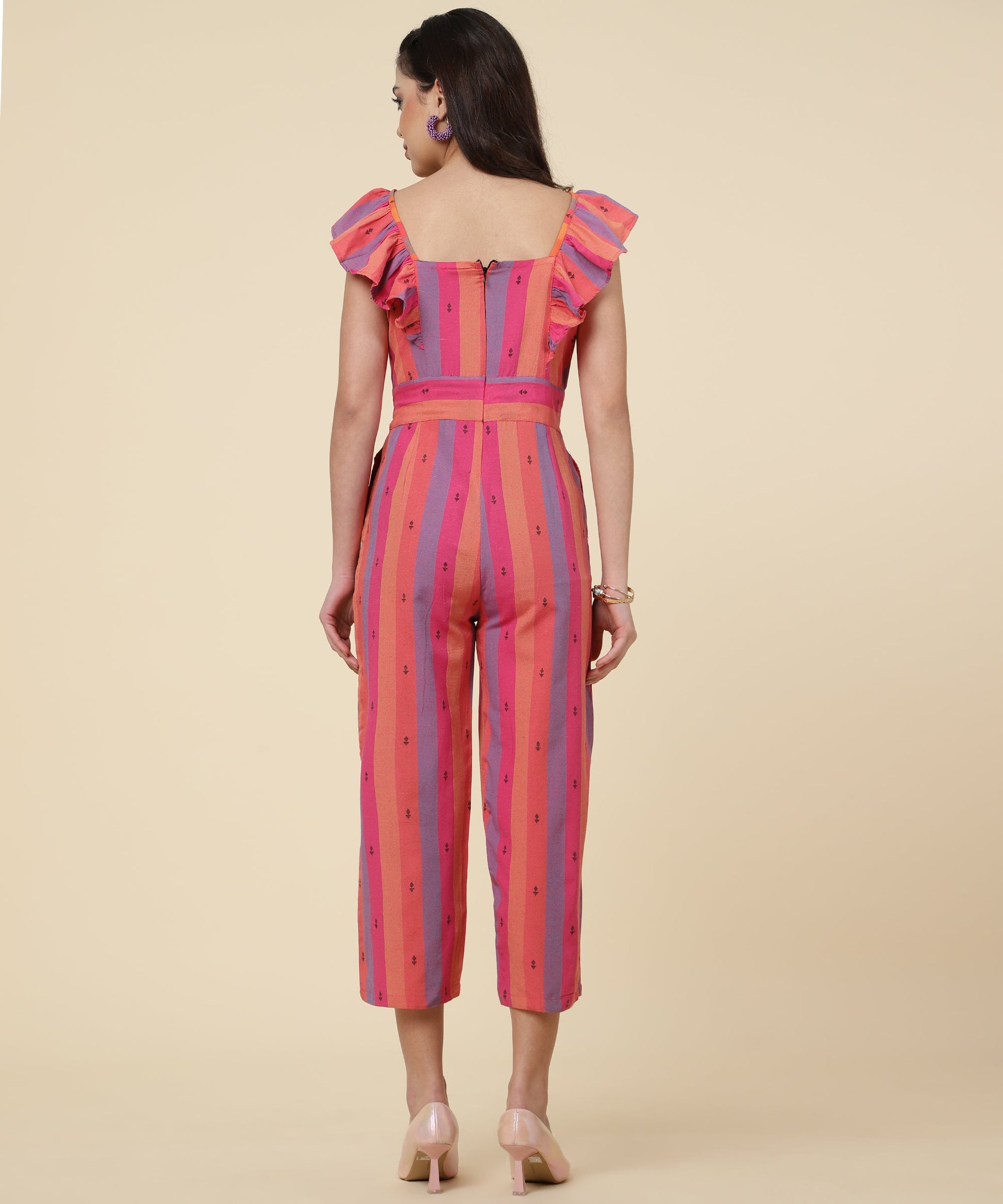 ANUSHIL Multicoloured Striped Jumpsuit for Women - Ruffle Sleeves, Ankle Length Jumsuit for Girls - Woven Cotton Fabric With Square Neck Style(Pink)
