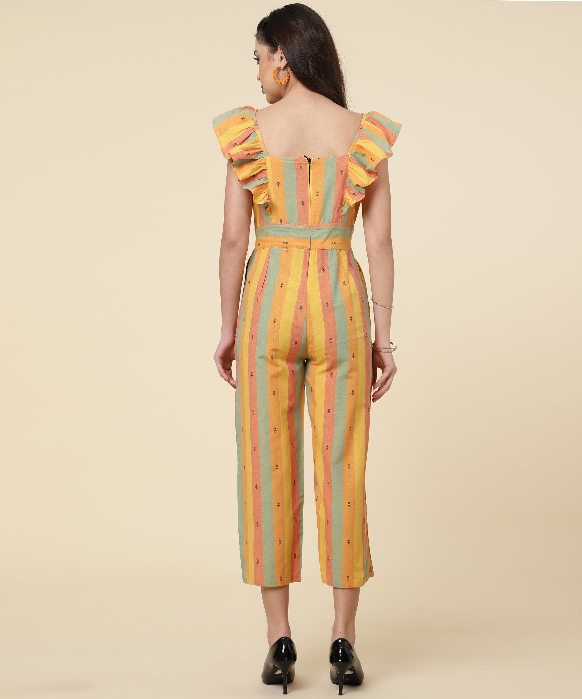 ANUSHIL Multicoloured Striped Jumpsuit for Women - Ruffle Sleeves, Ankle Length Jumsuit for Girls - Woven Cotton Fabric With Square Neck Style(Yellow)
