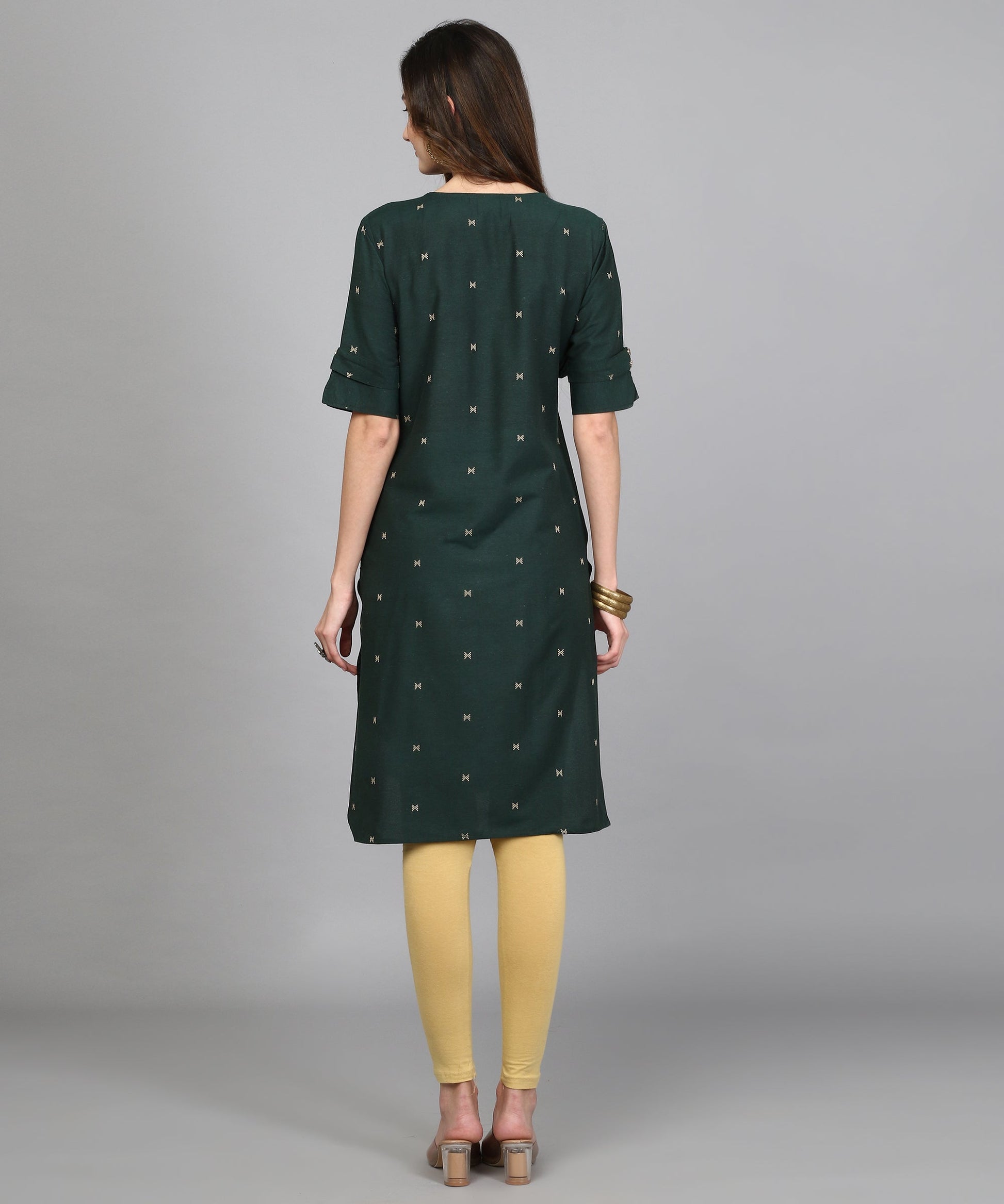 ANUSHIL Women Cotton Printed Center Slit Design V-Neck Elbow Sleeve Calf Length Kurti with Attached Koti (Green)