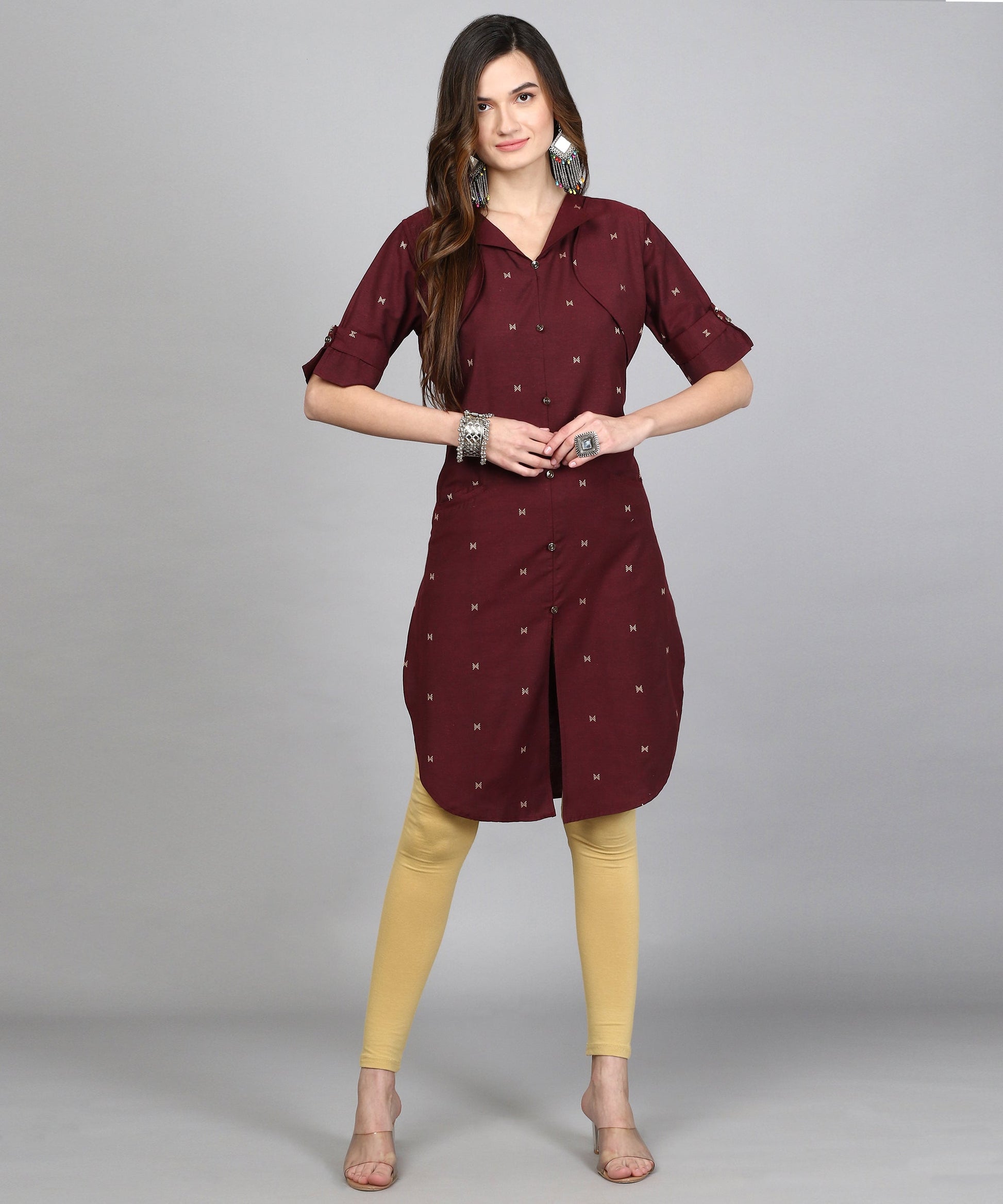 ANUSHIL Women Cotton Printed Center Slit Design V-Neck Elbow Sleeve Calf Length Kurti with Attached Koti (Maroon)