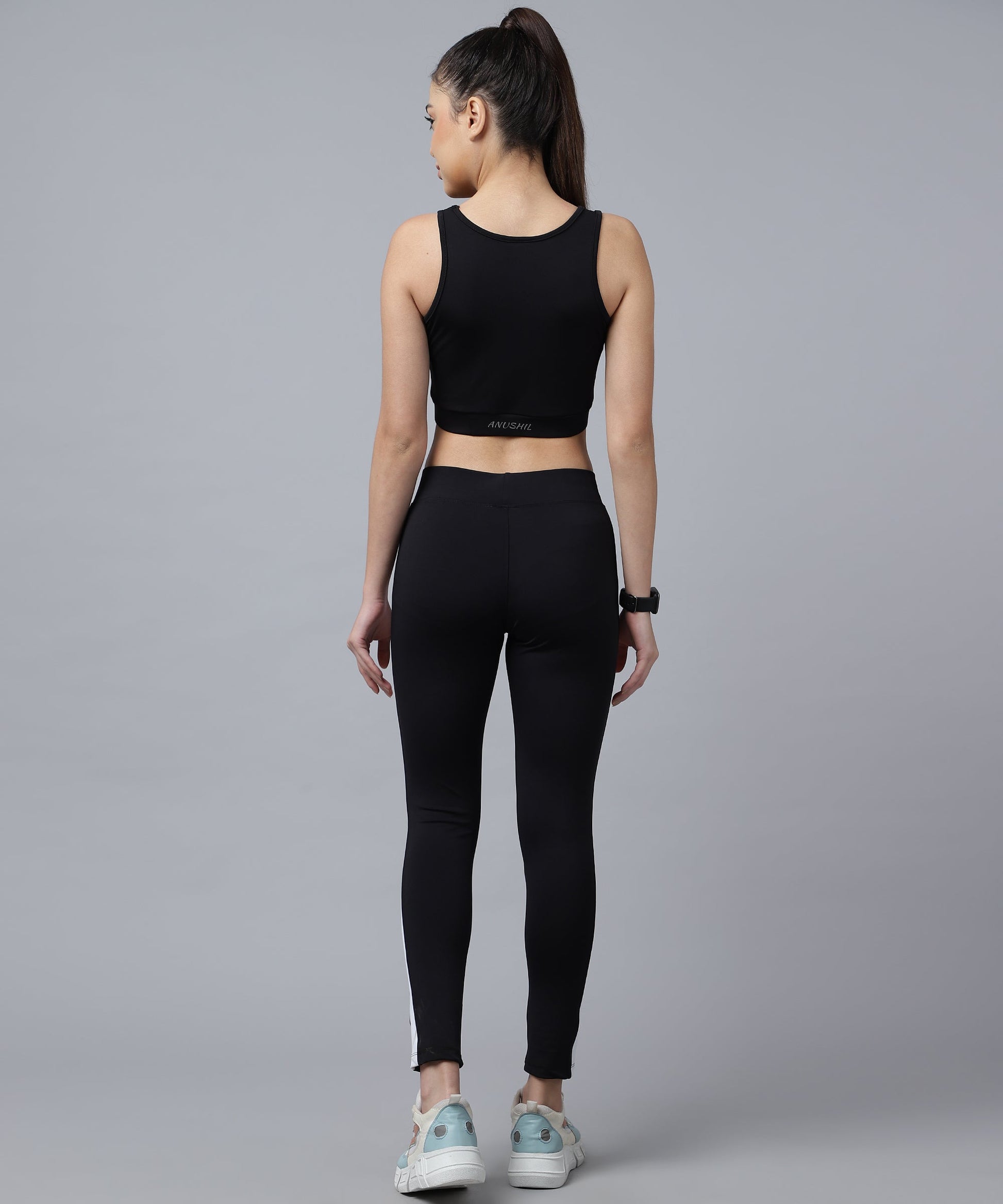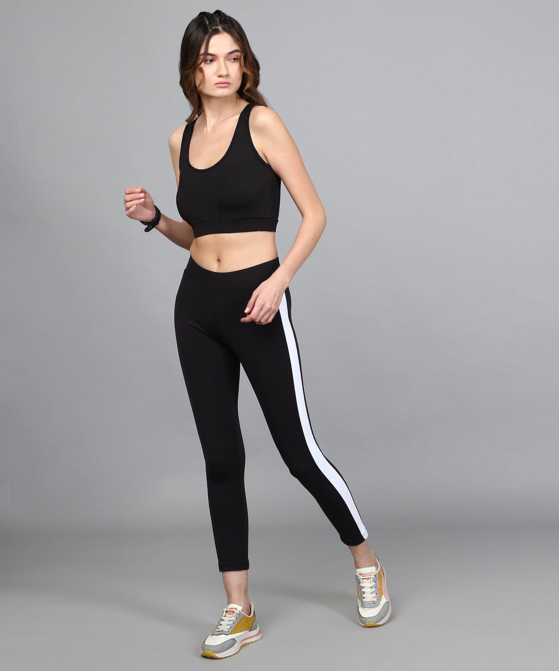 ANUSHIL Women Cotton Solid Sports Bra And Striped Jeggings For Gym Sports Yoga Swimming Running, (Color:-Black)