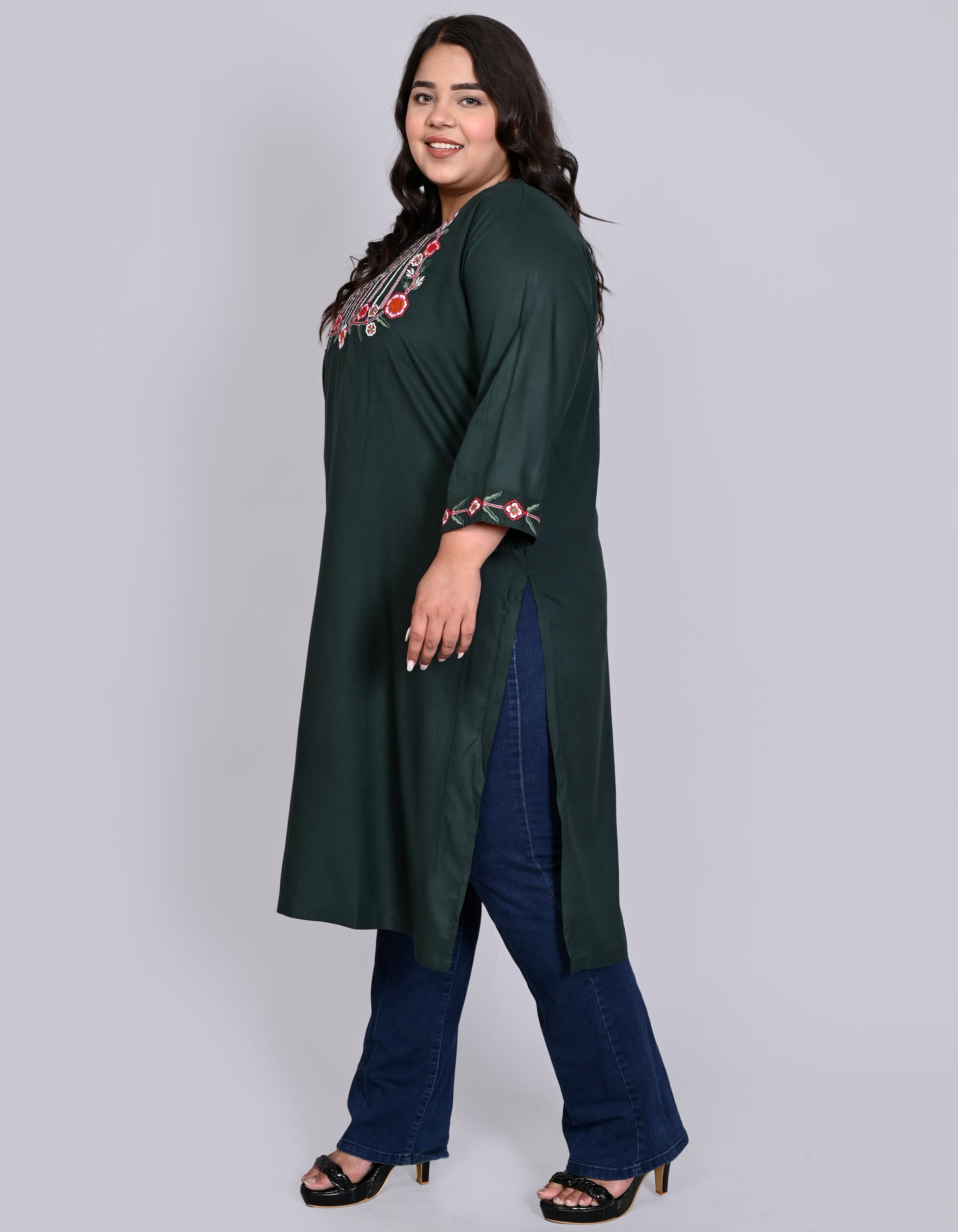 We are thrilled to present our exquisite Embroidered Cotton Rayon Kurti designed specifically for plus-size individuals. With a wide range of sizes from XL to 4XL, and three stunning color options - Pink, Yellow, and Green - our kurti is a perfect addition to your wardrobe. Made with good quality fabric and featuring embroidery details, this kurti is sure to make you stand out in any occasion. We understand the importance of a comfortable fit, especially for plus-size individuals. Our Anushil Embroidered Cotton Rayon Kurti is thoughtfully designed to provide a flattering fit for sizes ranging from XL to 4XL. Say goodbye to restrictive clothing and embrace the comfort of our plus-size kurti. At Anushil, we pride ourselves on our attention to detail and craftsmanship. Our Embroidered Cotton Rayon Kurti features intricate embroidery, meticulously done by skilled artisans. The delicate designs and patterns add a touch of elegance and sophistication to the kurti, making it a true statement piece. Whether you're attending a festive celebration or a casual outing, the embroidery on our kurti will make you shine. We understand the importance of personal style, which is why we offer our Embroidered Cotton Rayon Kurti in three stunning colors: Pink, Yellow, and Green. These vibrant and eye-catching hues allow you to express your individuality and match your outfit to any occasion. Whether you prefer a bold and vibrant look or a subtle and sophisticated one, our color options cater to your unique preferences. The comfort of our customers is of utmost importance to us. That's why our Embroidered Cotton Rayon Kurti is crafted from a blend of high-quality cotton and rayon fabrics. This combination ensures a soft and breathable feel, allowing your skin to breathe even in hot and humid weather conditions. To maintain the pristine condition and longevity of your Anushil Embroidered Cotton Rayon Kurti, we recommend following our care instructions.