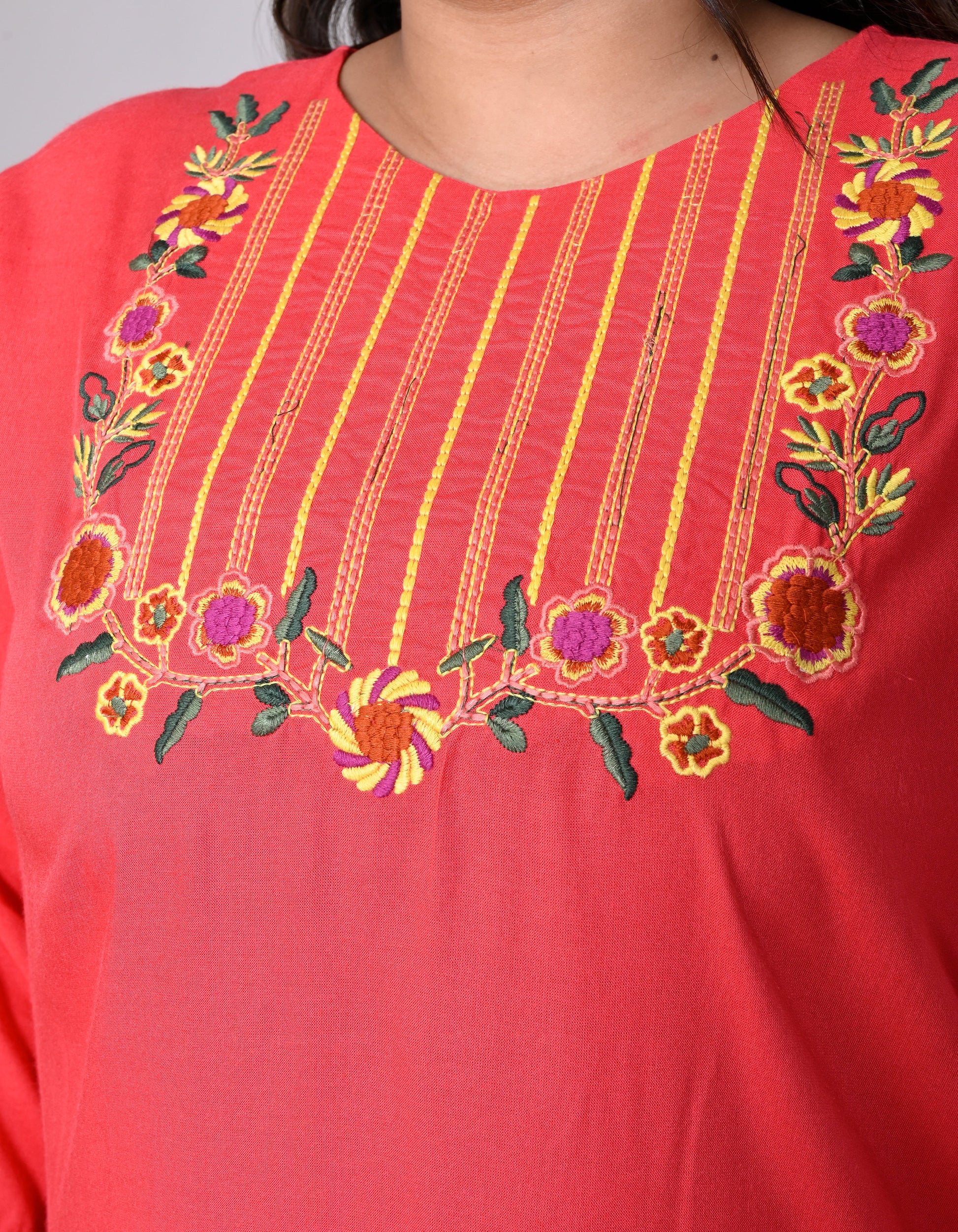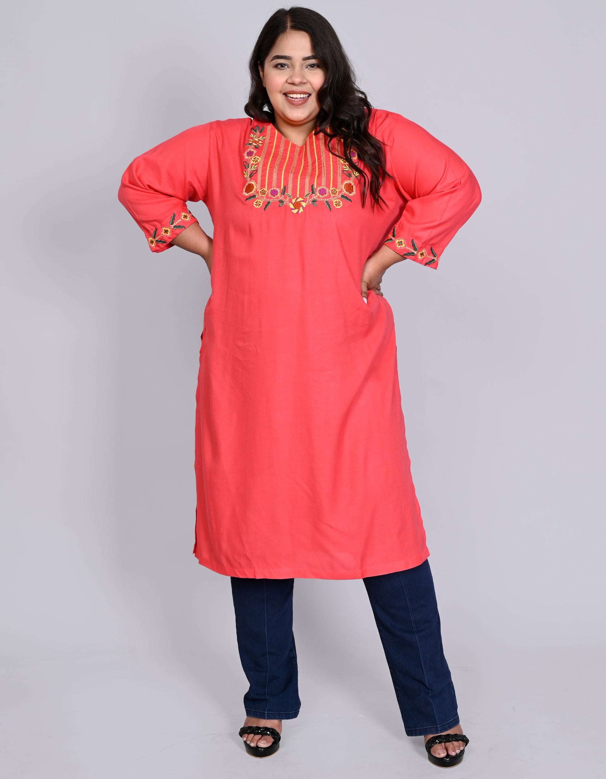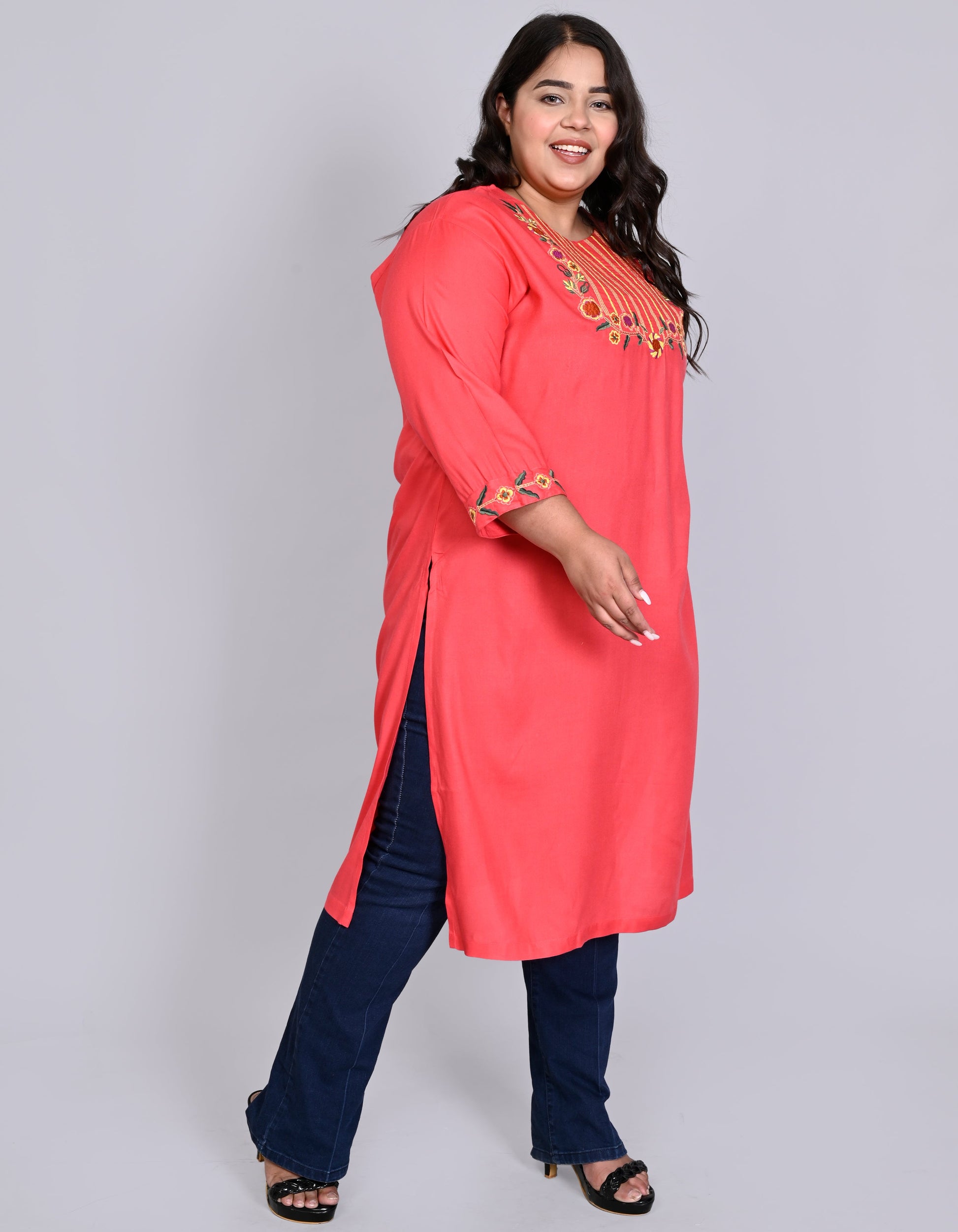 We are thrilled to present our exquisite Embroidered Cotton Rayon Kurti designed specifically for plus-size individuals. With a wide range of sizes from XL to 4XL, and three stunning color options - Pink, Yellow, and Green - our kurti is a perfect addition to your wardrobe. Made with good quality fabric and featuring embroidery details, this kurti is sure to make you stand out in any occasion. We understand the importance of a comfortable fit, especially for plus-size individuals. Our Anushil Embroidered Cotton Rayon Kurti is thoughtfully designed to provide a flattering fit for sizes ranging from XL to 4XL. Say goodbye to restrictive clothing and embrace the comfort of our plus-size kurti. At Anushil, we pride ourselves on our attention to detail and craftsmanship. Our Embroidered Cotton Rayon Kurti features intricate embroidery, meticulously done by skilled artisans. The delicate designs and patterns add a touch of elegance and sophistication to the kurti, making it a true statement piece. Whether you're attending a festive celebration or a casual outing, the embroidery on our kurti will make you shine. We understand the importance of personal style, which is why we offer our Embroidered Cotton Rayon Kurti in three stunning colors: Pink, Yellow, and Green. These vibrant and eye-catching hues allow you to express your individuality and match your outfit to any occasion. Whether you prefer a bold and vibrant look or a subtle and sophisticated one, our color options cater to your unique preferences. The comfort of our customers is of utmost importance to us. That's why our Embroidered Cotton Rayon Kurti is crafted from a blend of high-quality cotton and rayon fabrics. This combination ensures a soft and breathable feel, allowing your skin to breathe even in hot and humid weather conditions. To maintain the pristine condition and longevity of your Anushil Embroidered Cotton Rayon Kurti, we recommend following our care instructions.