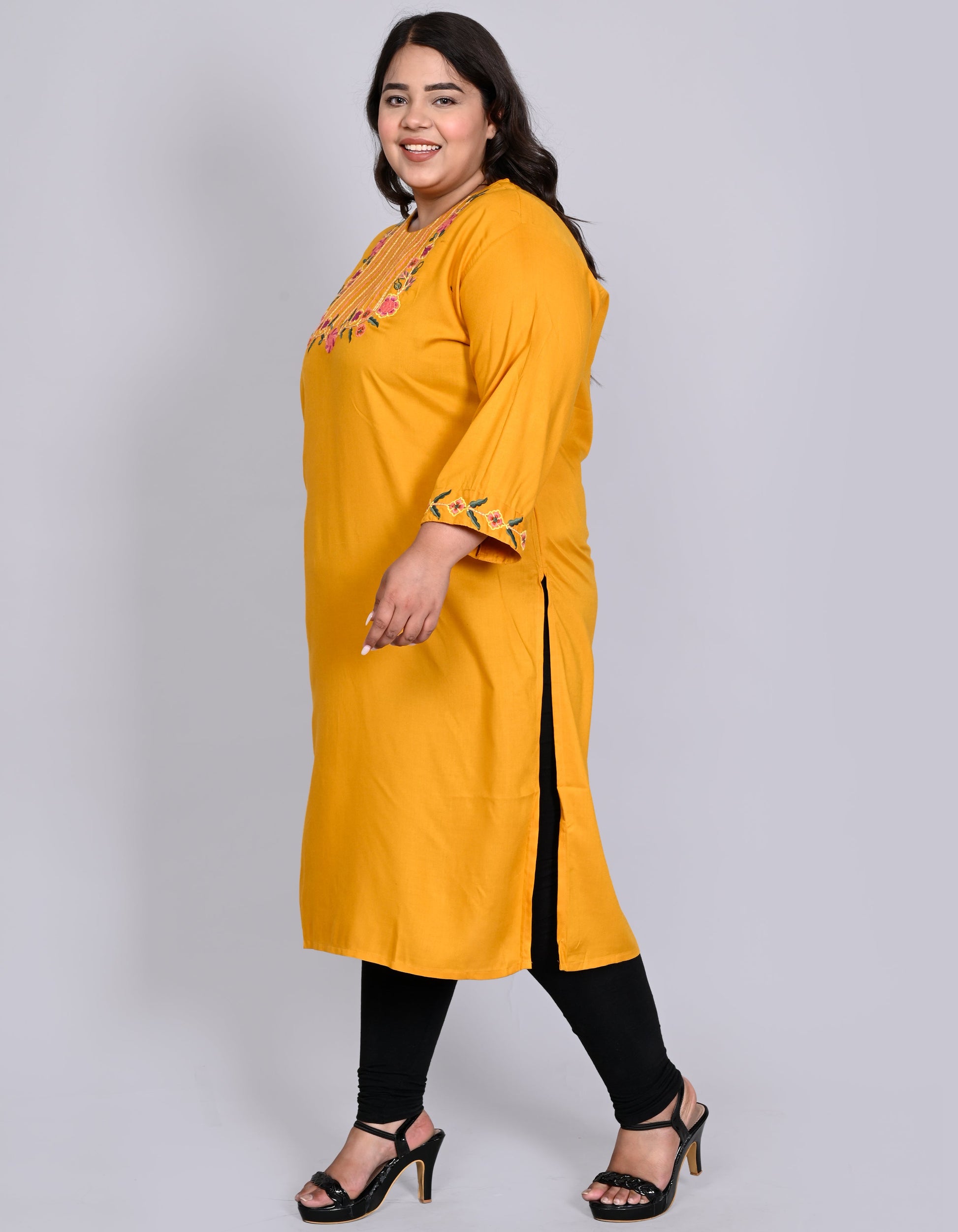 Introducing our stunning knee length embroidered straight kurta, the perfect addition to your ethnic wardrobe. Crafted from high quality cotton fabric, this kurta offers both comfort and style. The intricate embroidery on the kurta adds a touch of elegance and sophistication, making it ideal for any festive yet formal occasion. The straight cut design of the kurta accentuates your figure, while the knee length provides a modest yet fashionable look. The kurta features a classic round neckline and full sleeves, making it suitable for all seasons. Pair it with your favorite leggings or palazzo pants and accessorize with statement jewelry to complete the look. Make a statement at your next event with this beautiful knee length embroidered straight kurta.