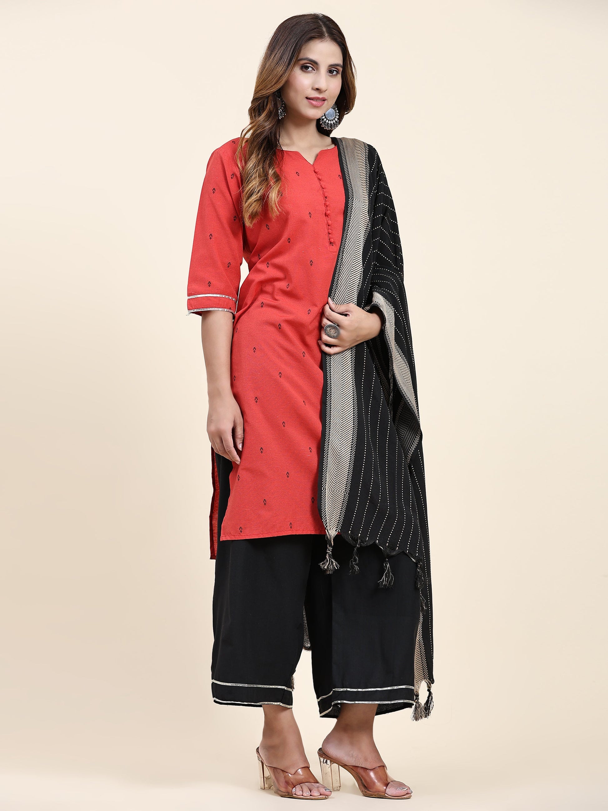 ANUSHIL Women's Cotton Kurta Plazzo Dupatta Set - Graceful Lace Detailing and Comfortable 3/4 Sleeves (Red)