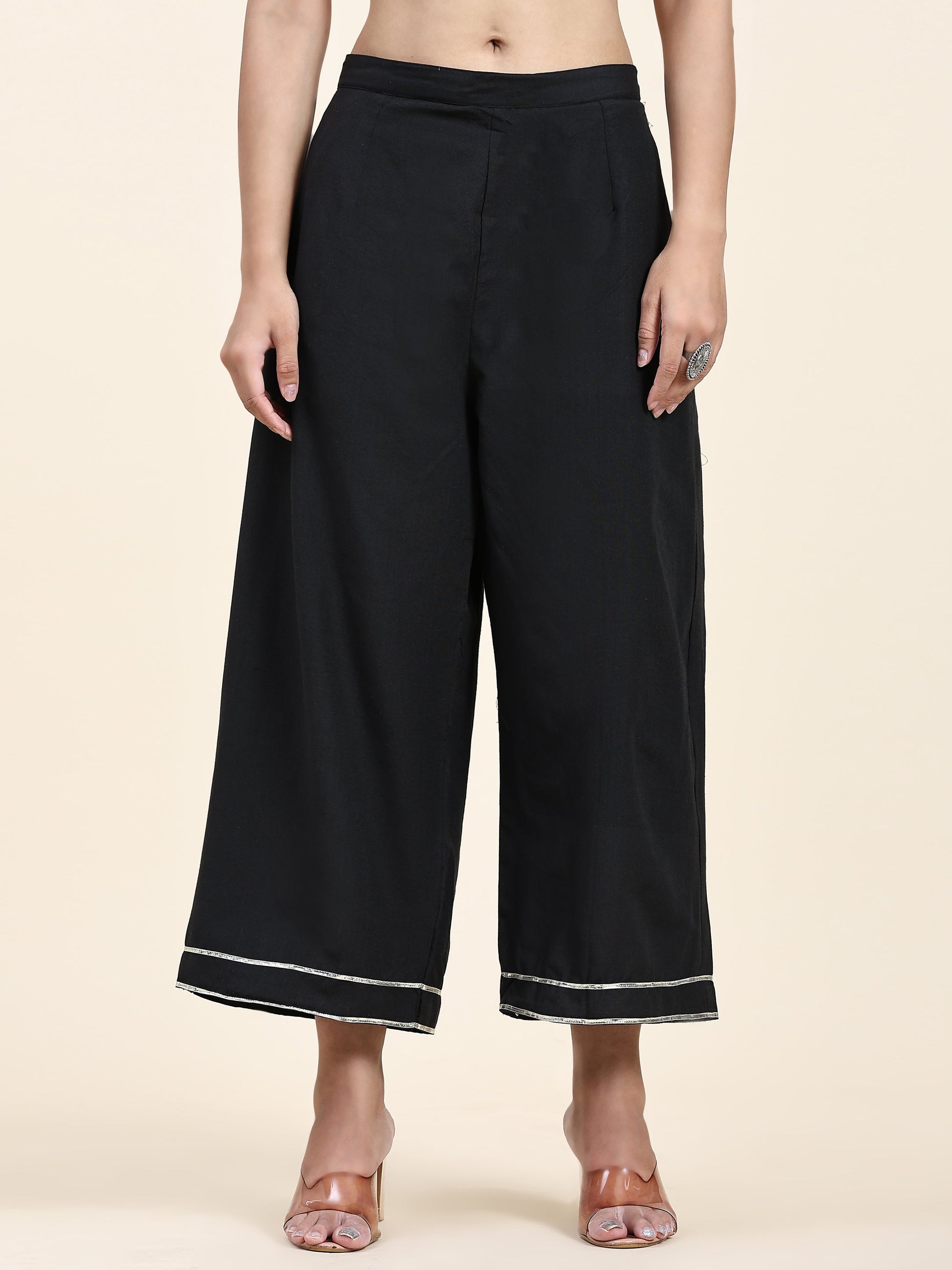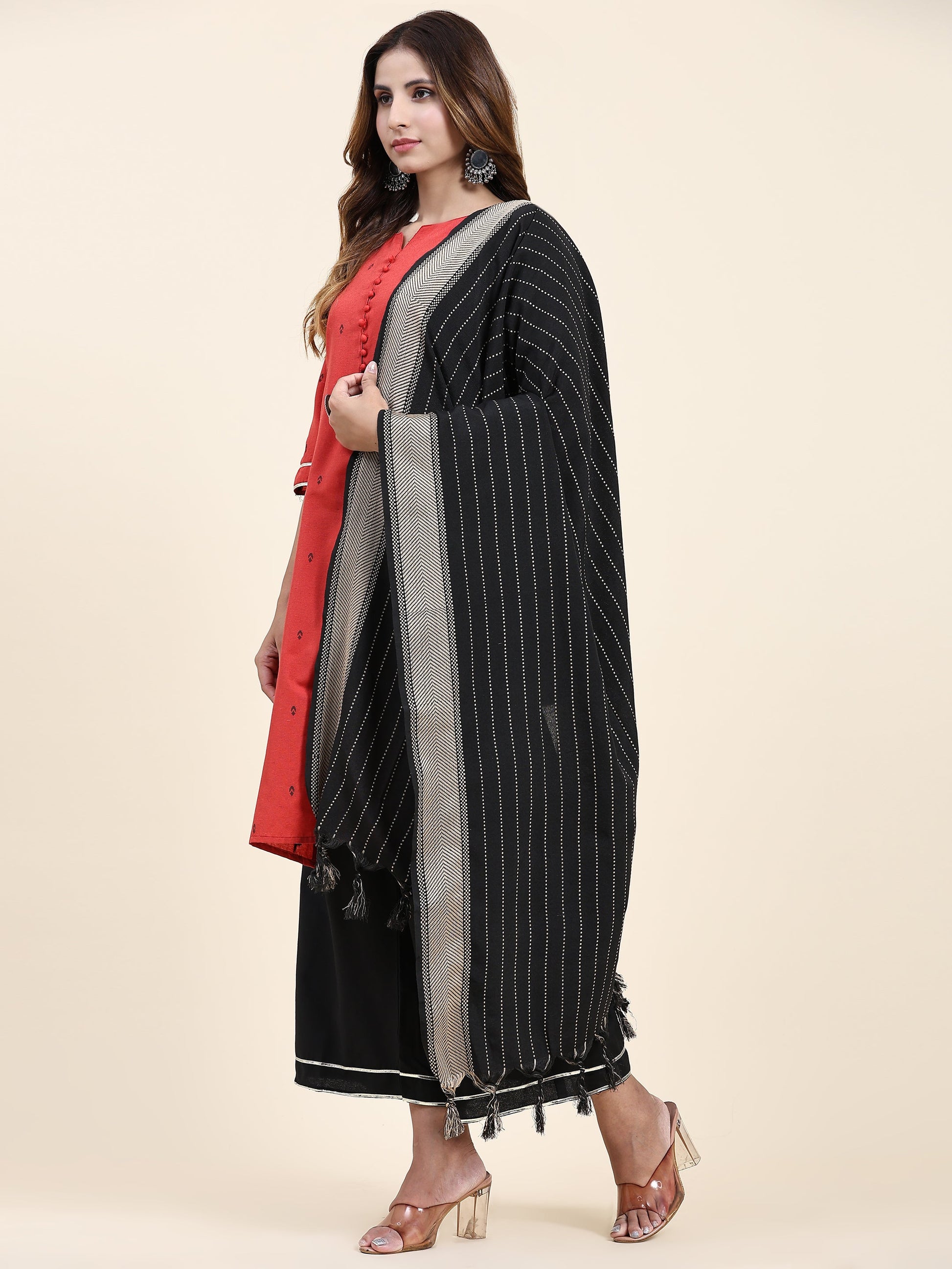 Introducing the Anushil Women's Cotton Kurta Plazzo Dupatta Set, a perfect combination of grace, style, and comfort. This set features a stunning kurta with graceful lace detailing and comfortable 3/4 sleeves, paired with a matching plazzo in three captivating color options. Choose from a red kurta with black plazo, yellow kurta with red plazo, or dark blue kurta with blue plazo, all available in sizes ranging from large to 3XL. Crafted with utmost care, the kurta is made from good quality cotton fabric that ensures breathability and durability. The soft and lightweight material feels gentle against the skin, making it ideal for all-day wear. The lace detailing adds a touch of elegance, enhancing the overall aesthetic appeal of the set. The 3/4 sleeves of the kurta offer a versatile and stylish look, providing coverage while keeping you cool and comfortable. Whether you're attending a casual gathering, a festive occasion, or a formal event, this set is designed to make you stand out with its unique blend of sophistication and trendiness. The matching plazzo is designed with precision, featuring a flattering fit and a relaxed silhouette. The combination of colors and patterns creates a visually appealing contrast, adding a modern touch to the traditional attire. It provides ease of movement and allows you to express your personal style effortlessly. Available in sizes ranging from large to 3XL, this kurta plazzo dupatta set ensures a comfortable and flattering fit for women of different body types. The versatile color options - red with black plazo, yellow with red plazo, and blue with dark blue plazo - offer versatility and give you the freedom to choose the one that complements your style and mood. Elevate your ethnic wardrobe with the Anushil Women's Cotton Kurta Plazzo Dupatta Set, a perfect fusion of elegance and comfort. Whether you're attending a festive celebration, a family gathering, or a casual outing, this set will make you feel confident and fashionable.