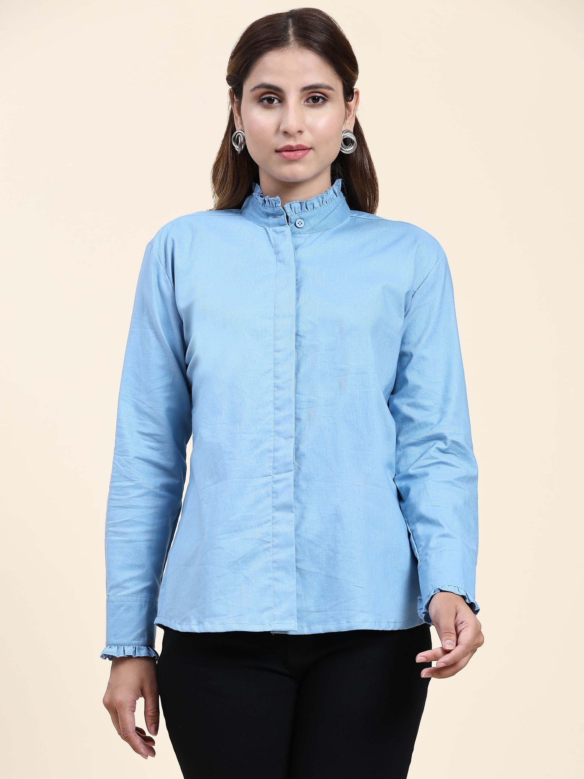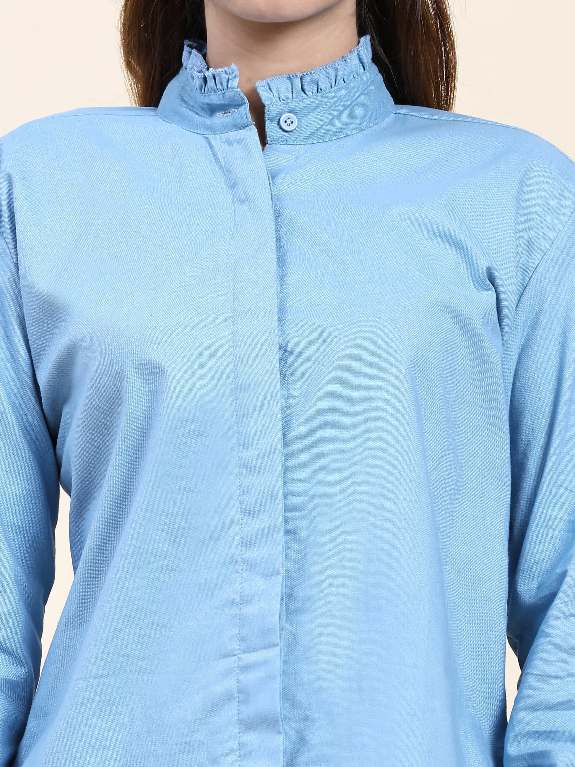 The cool blue shades are perfect for a refreshing and vibrant look, while the long sleeves make them ideal for colder seasons or air-conditioned environments. Designed to meet the demands of today's fashion-forward women, our ANUSHIL Women's Cotton Shirts are suitable for various occasions. From office wear to casual outings, these shirts effortlessly transition from day to night.