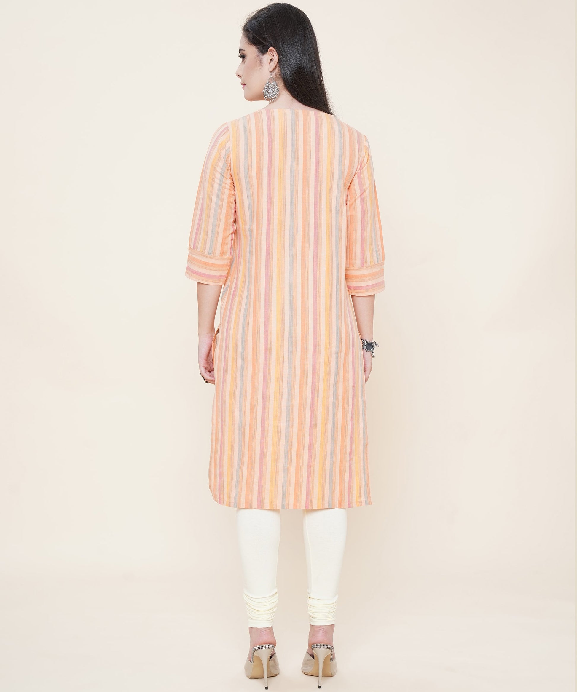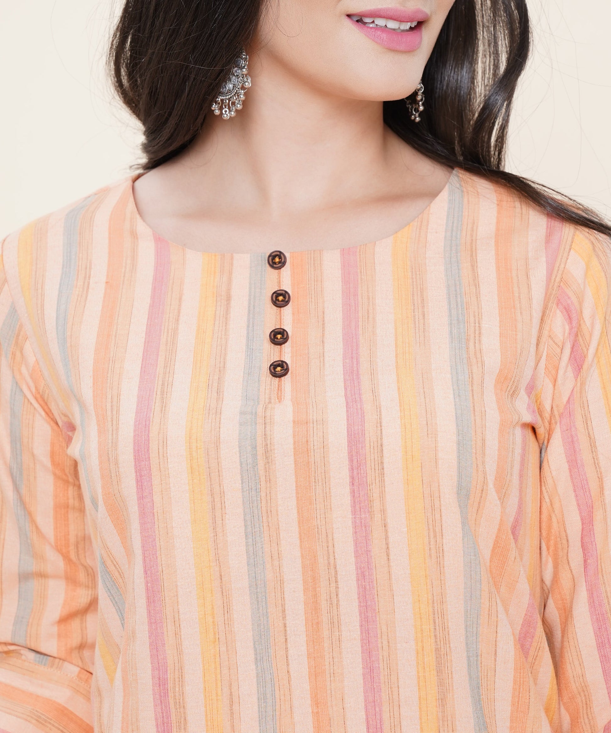 Women Cotton Multicolour Strip Pattern Round Neck Style with Buttons 3/4th Sleeves (Color:-Orange)