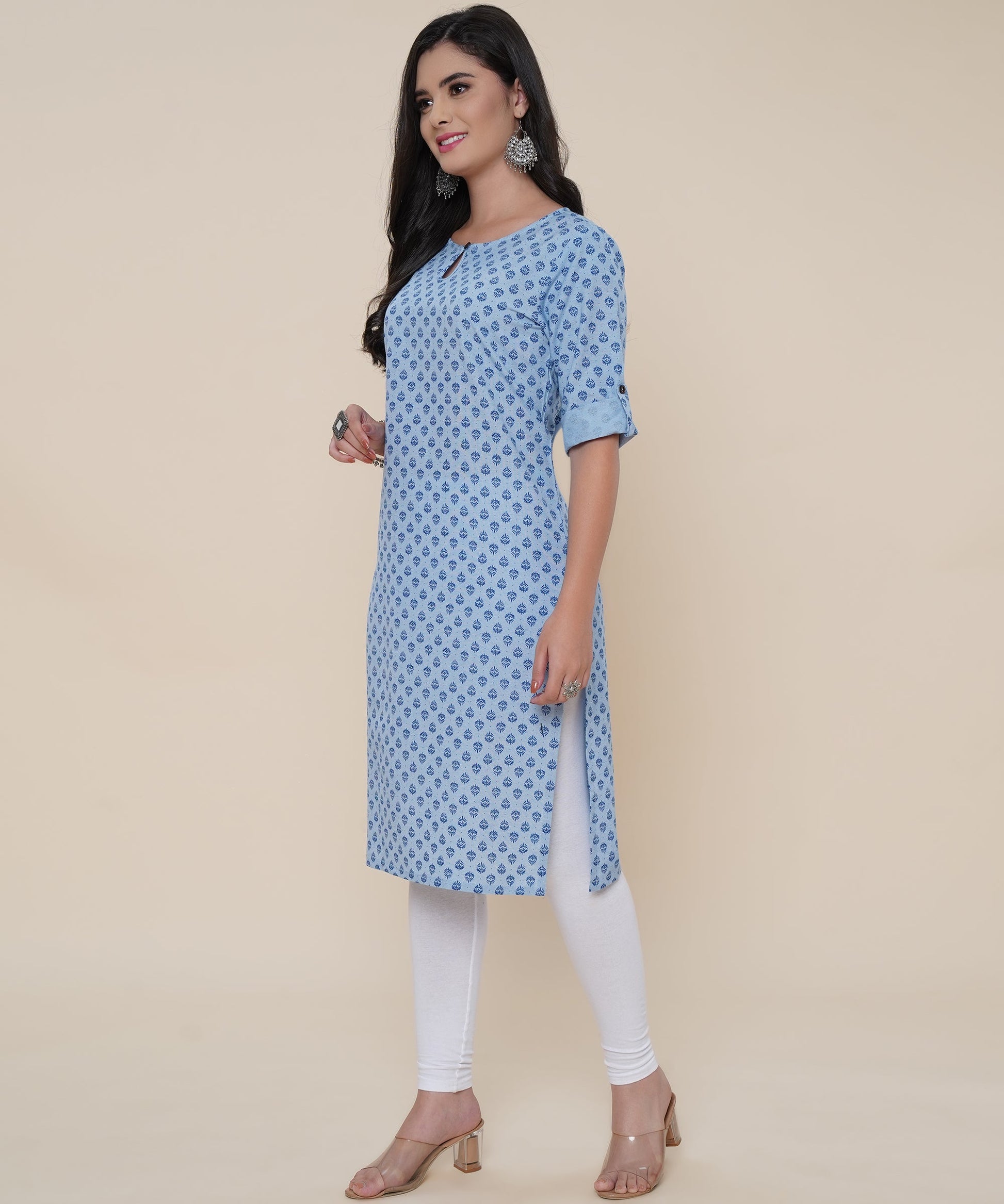 Cotton Printed Kurta Design with Tap Sleeve Button Style, Blue