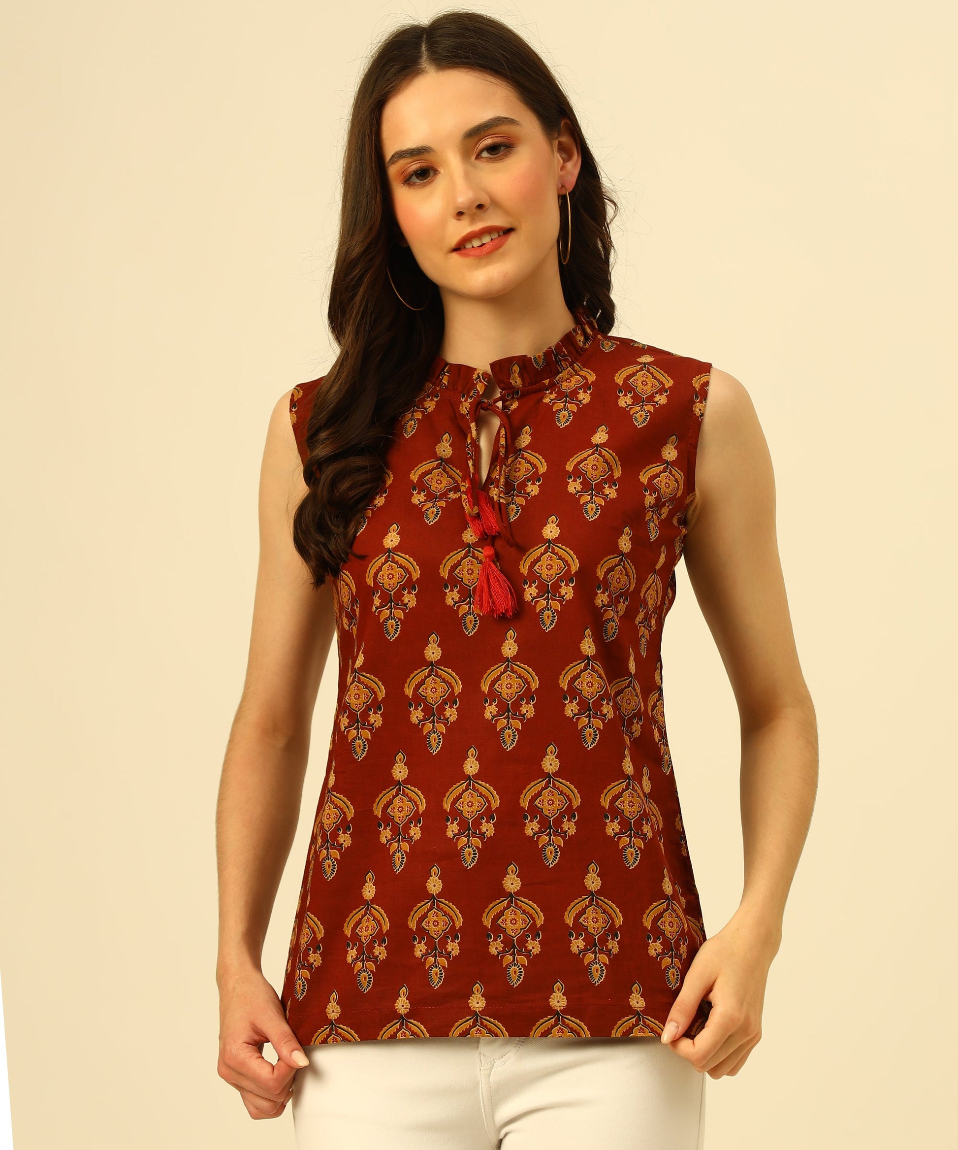 Cotton Printed Sleeveless Regular Fit Office Wear Casual Wear Top, Maroon