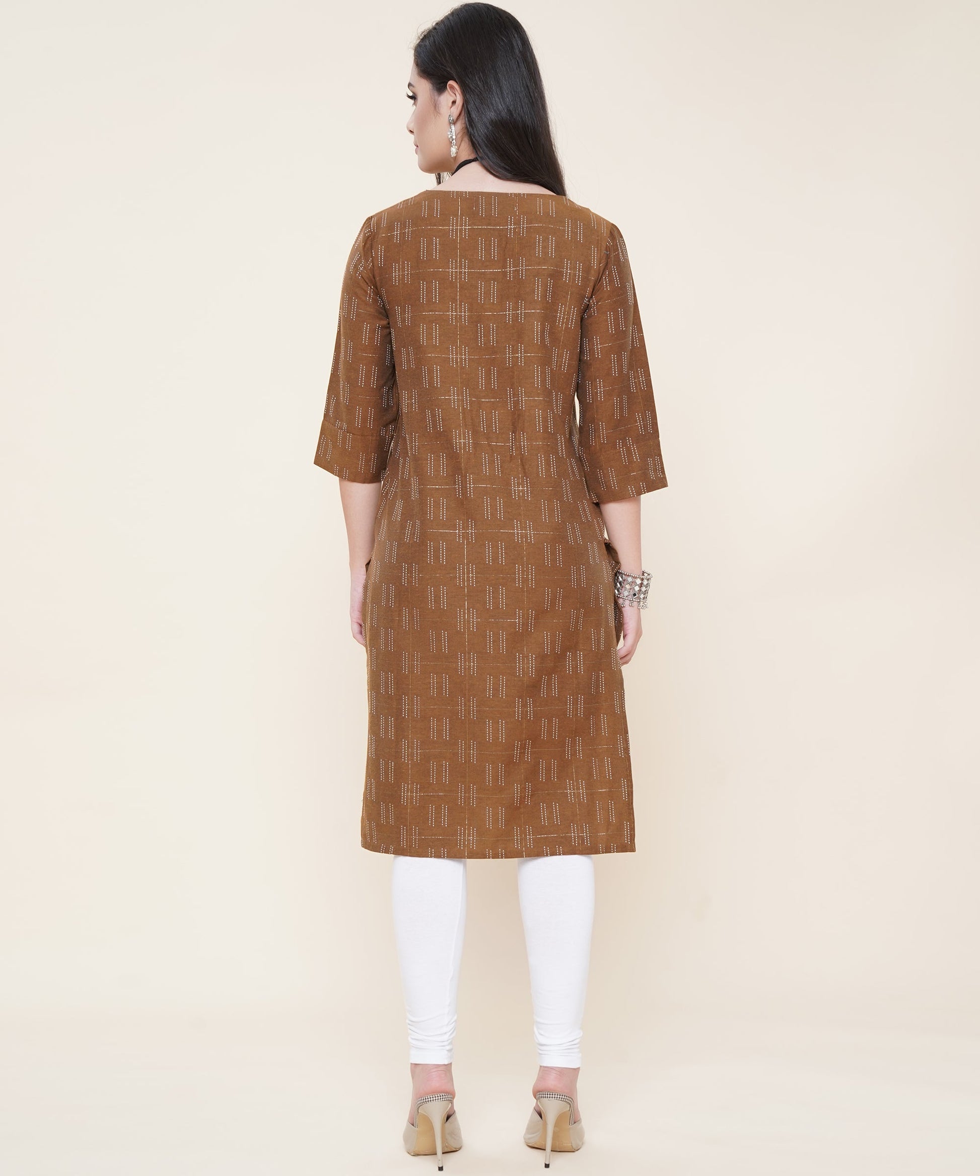 Cotton Self Weaved Kurta Design with Golden Button, Brown