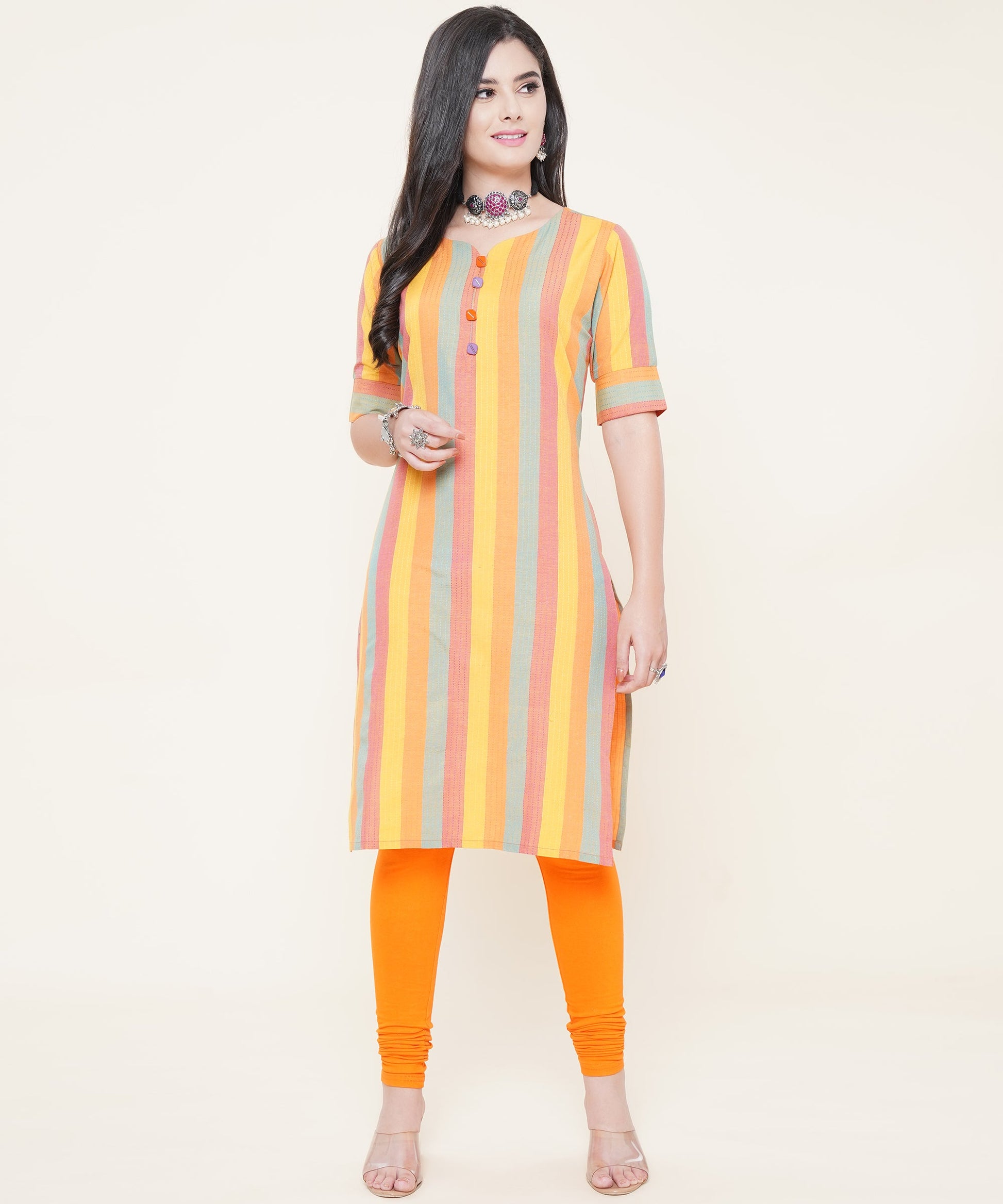 - Woven Kurti with a Keyhole Sweet Heart Neck, Elbow sleeves With Tap , and calf length with fashionable buttons
