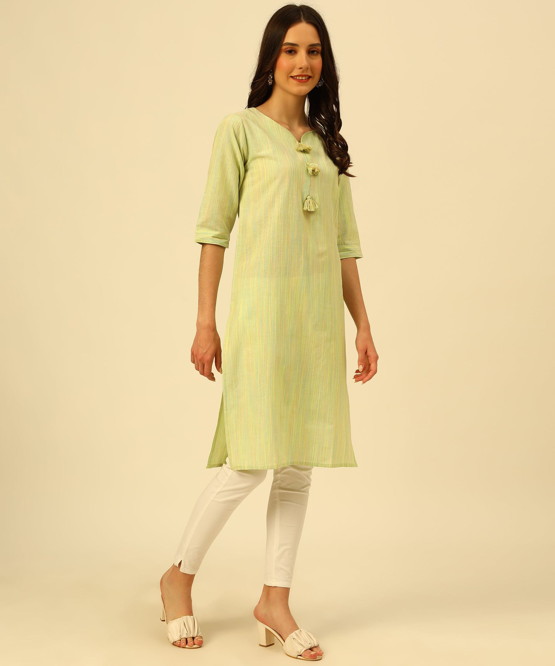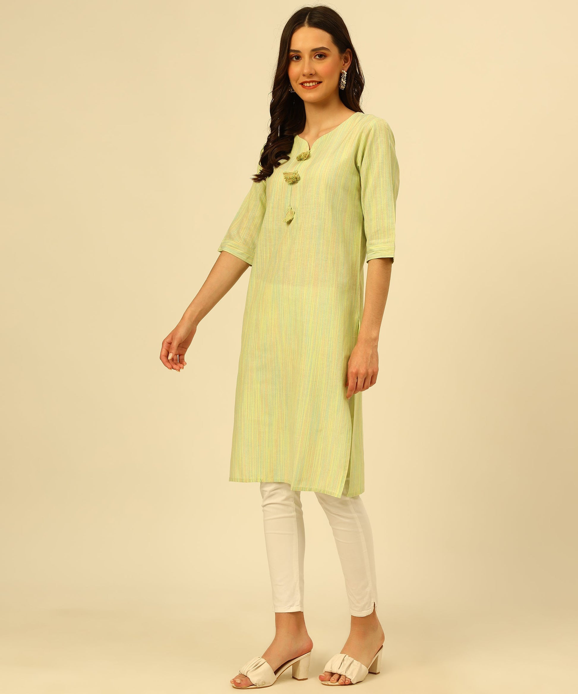 - Woven Kurti with a Keyhole Sweet Heart Neck, 3/4 sleeves With Tap , and calf length with fashionable Multi Colour Tassels