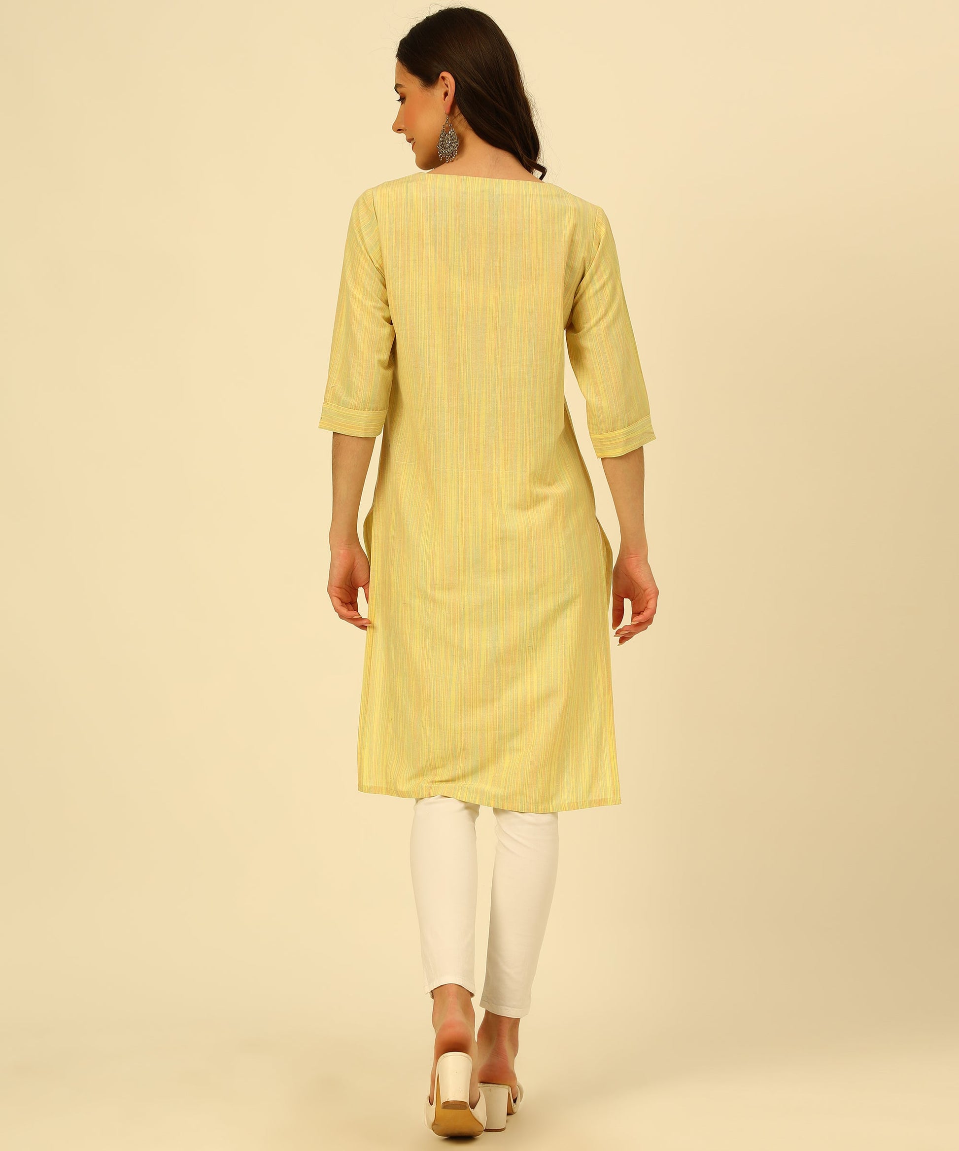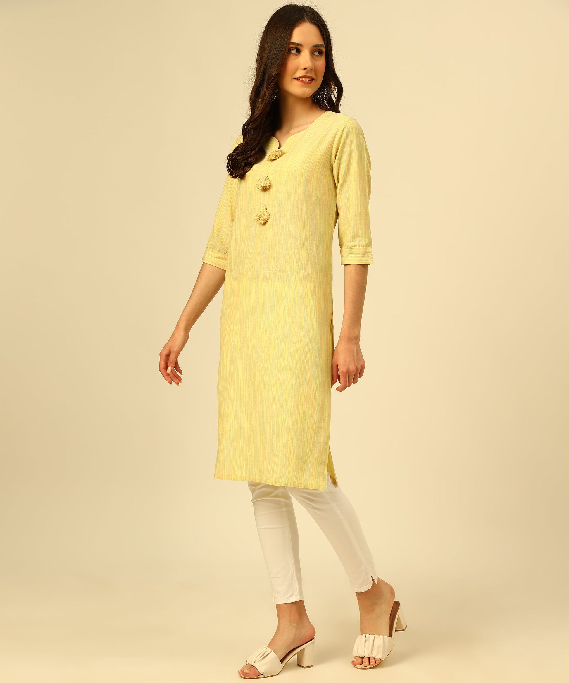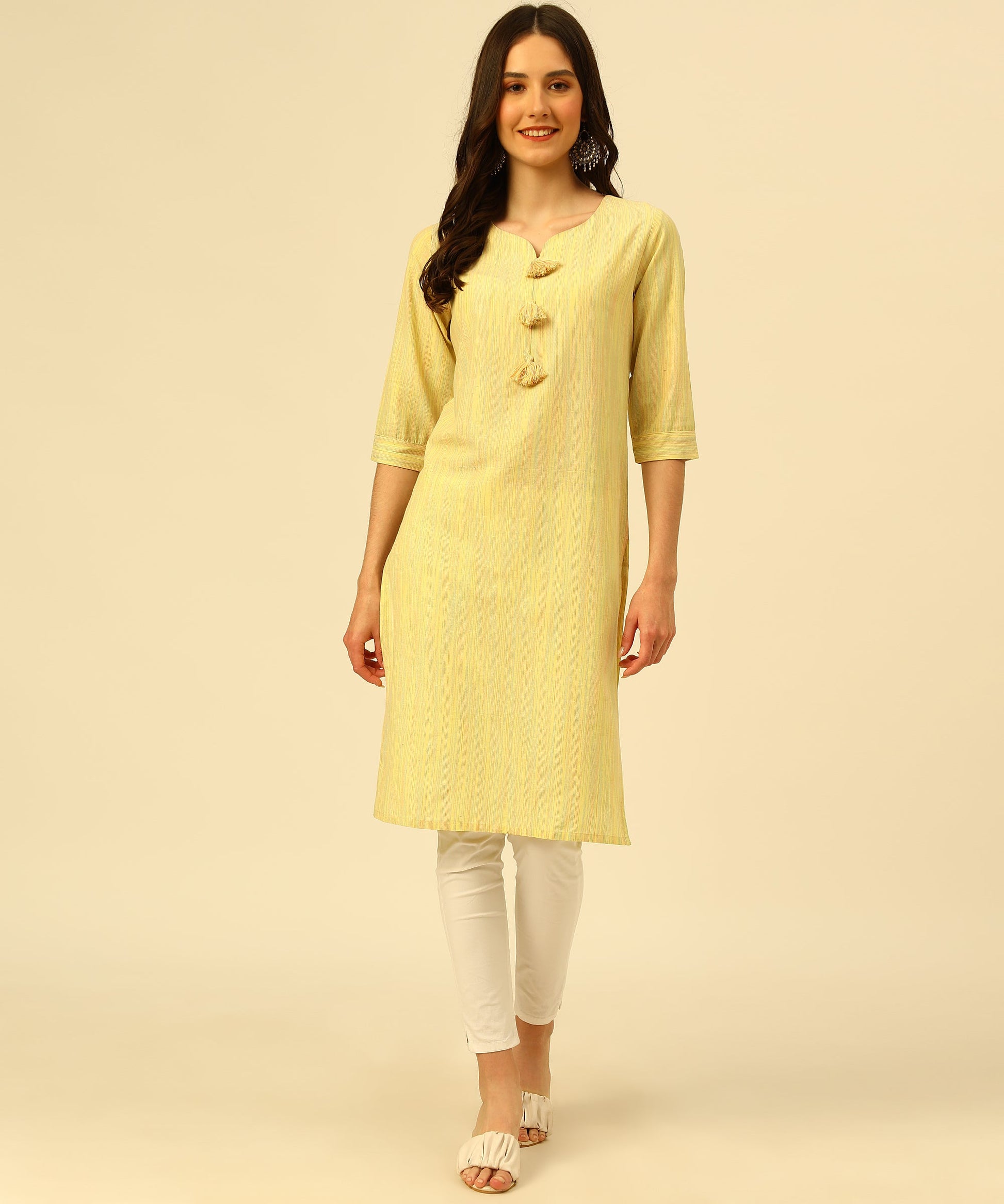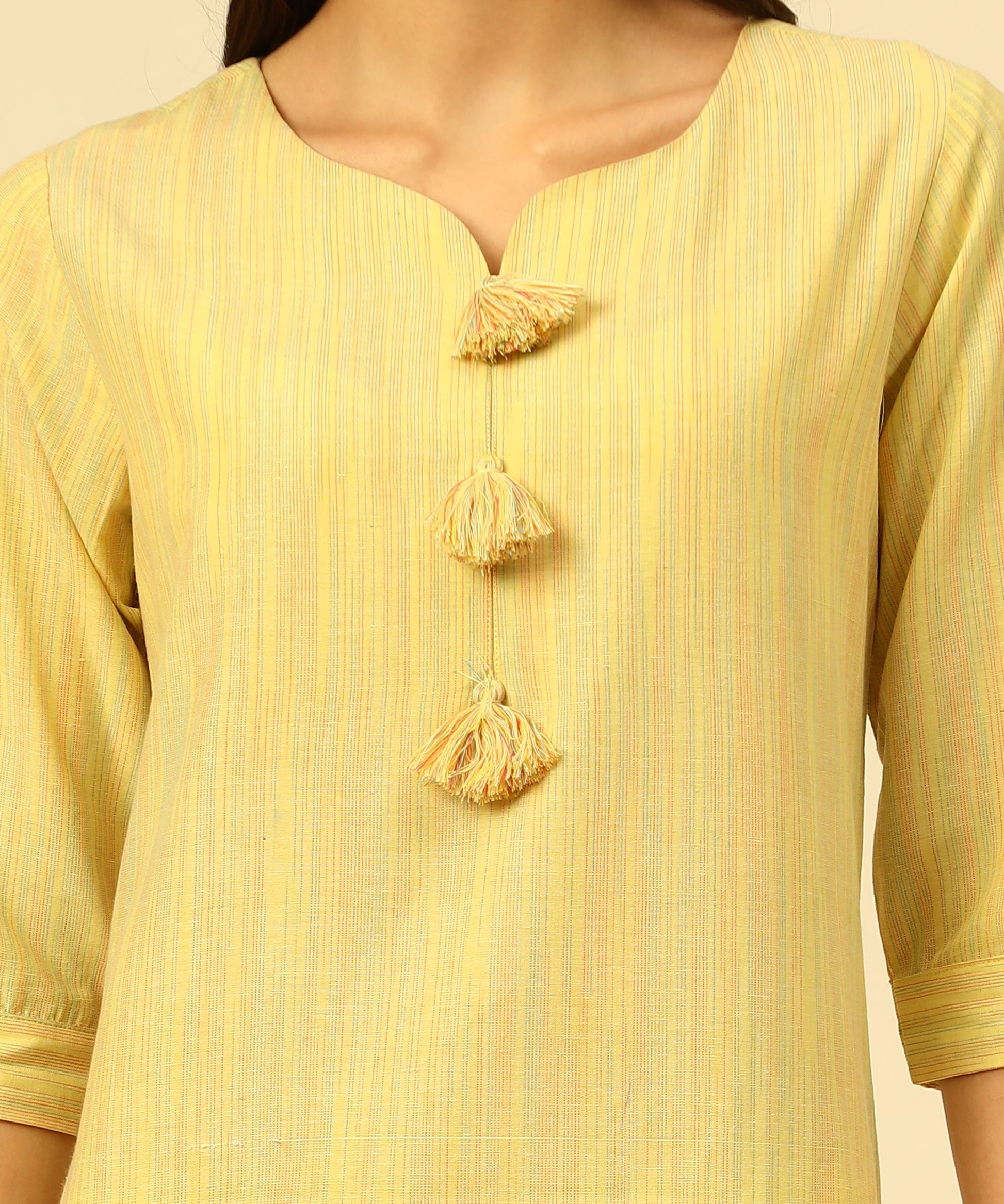 - Woven Kurti with a Keyhole Sweet Heart Neck, 3/4 sleeves With Tap , and calf length with fashionable Multi Colour Tassels