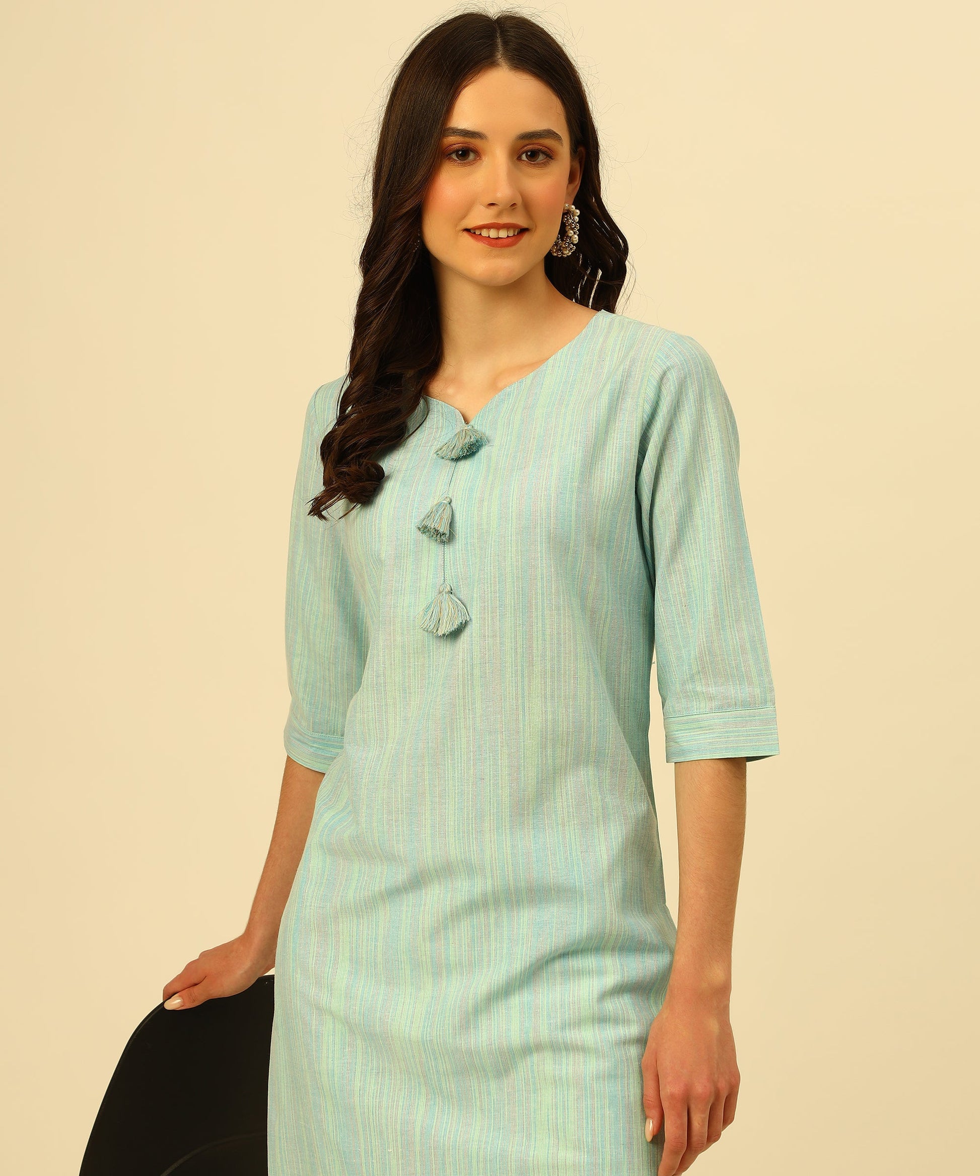 - Woven Kurti with a Keyhole Sweet Heart Neck, 3/4 sleeves With Tap , and calf length with fashionable Multi Colour Tassels