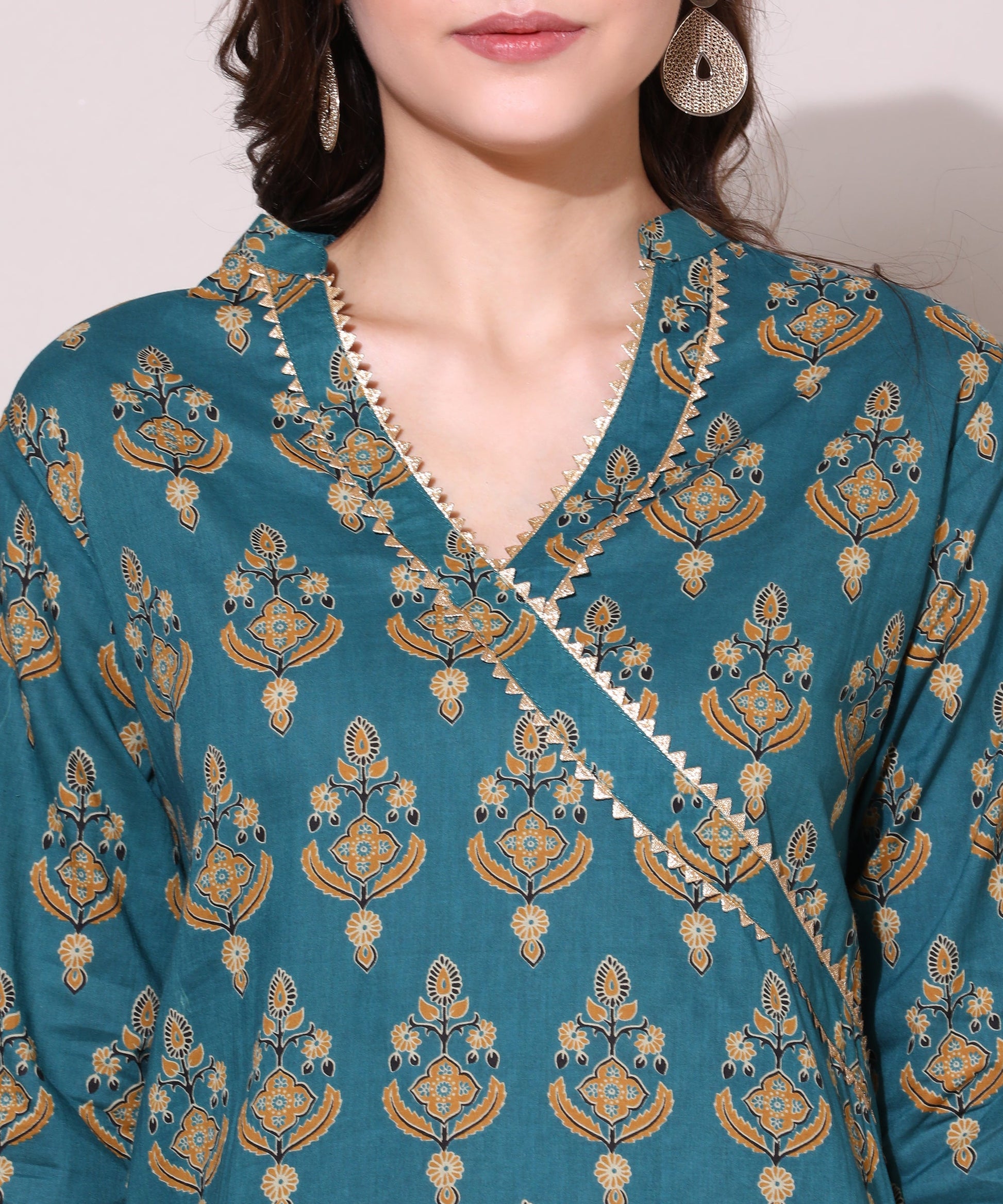 A simple yet fashionable kurta elevates the appearance. The pure cotton fabric used to create the 3/4-sleeve Pattern with Block printed Kurta is lightweight and portable. It may be worn wherever and for any circumstance, including casual work settings and party events. The design is more aesthetically pleasing and sober. It is embellished with angrakha-style golden lace work.