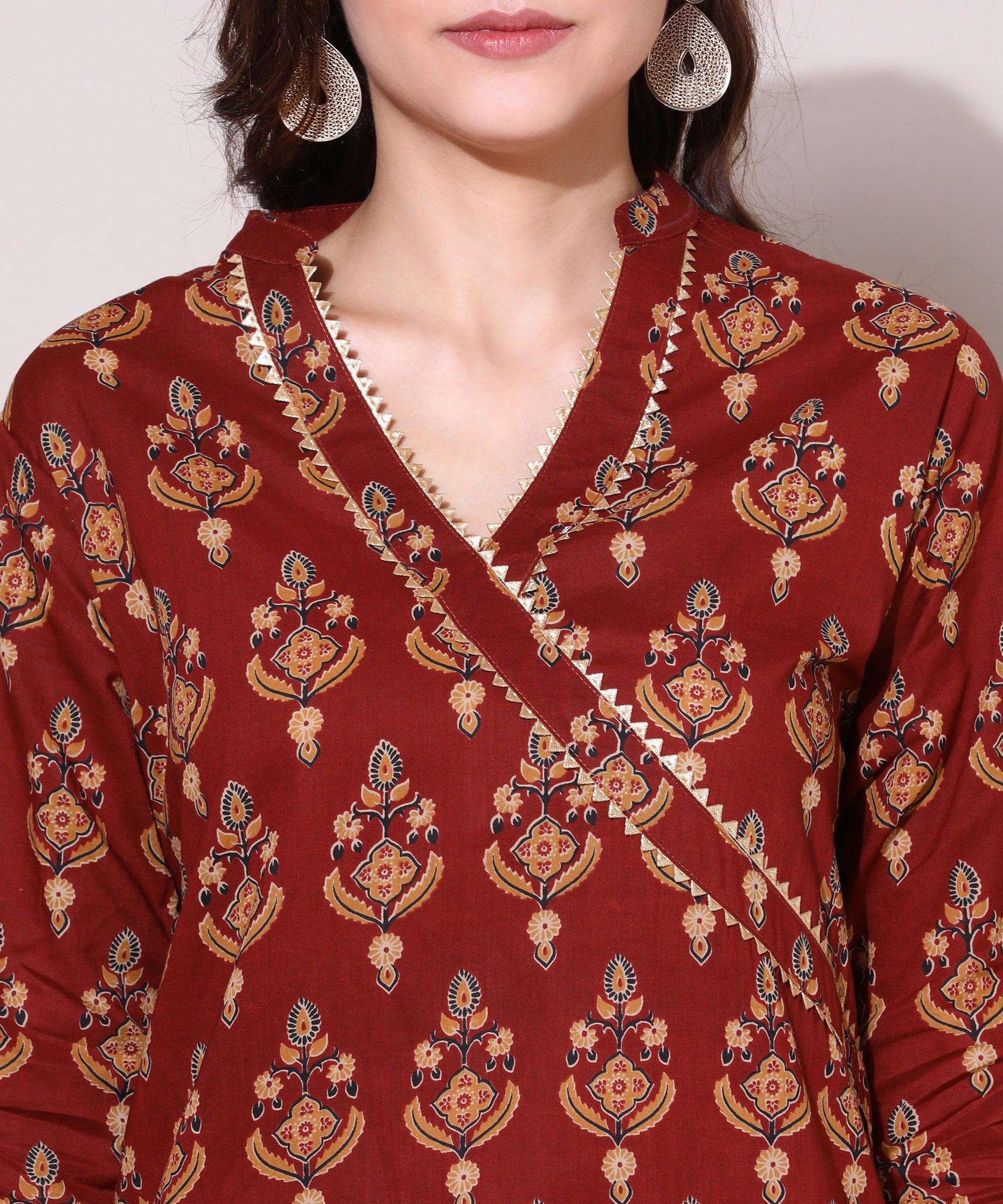 A simple yet fashionable kurta elevates the appearance. The pure cotton fabric used to create the 3/4-sleeve Pattern with Block printed Kurta is lightweight and portable. It may be worn wherever and for any circumstance, including casual work settings and party events. The design is more aesthetically pleasing and sober. It is embellished with angrakha-style golden lace work.