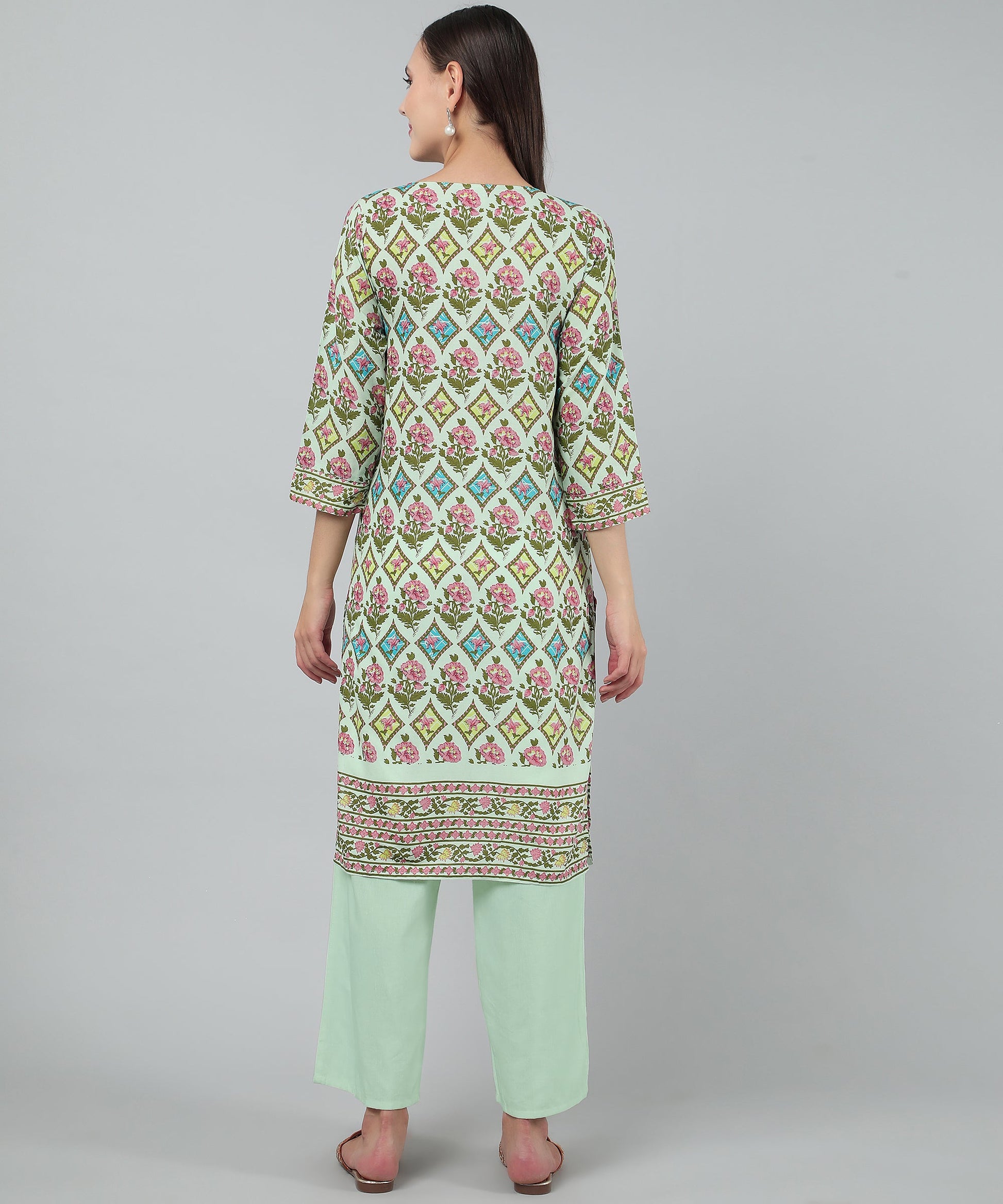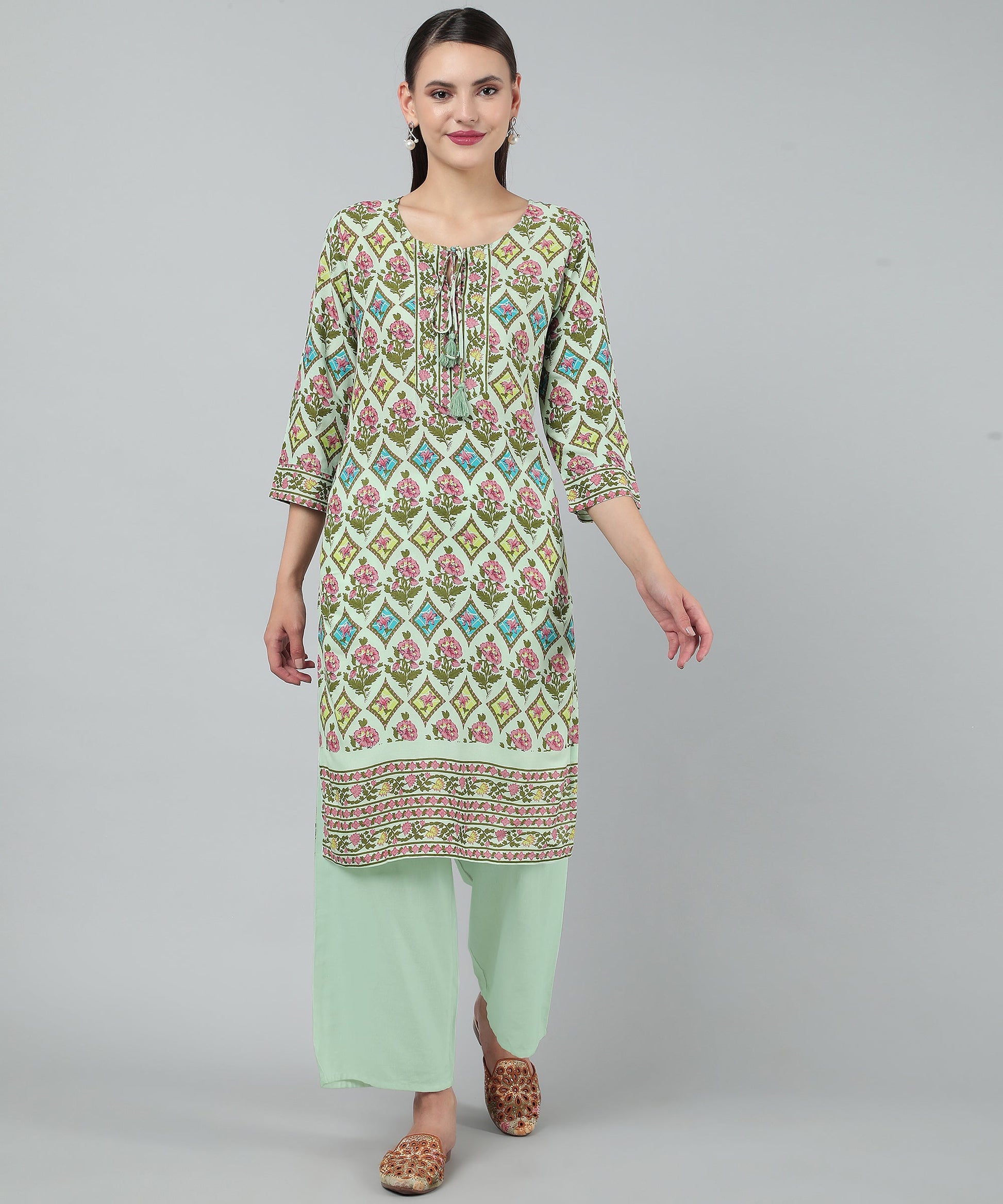 Pritned Rayon Cotton Kurti with Keyhole Neck Tassels and Drawstring,Green