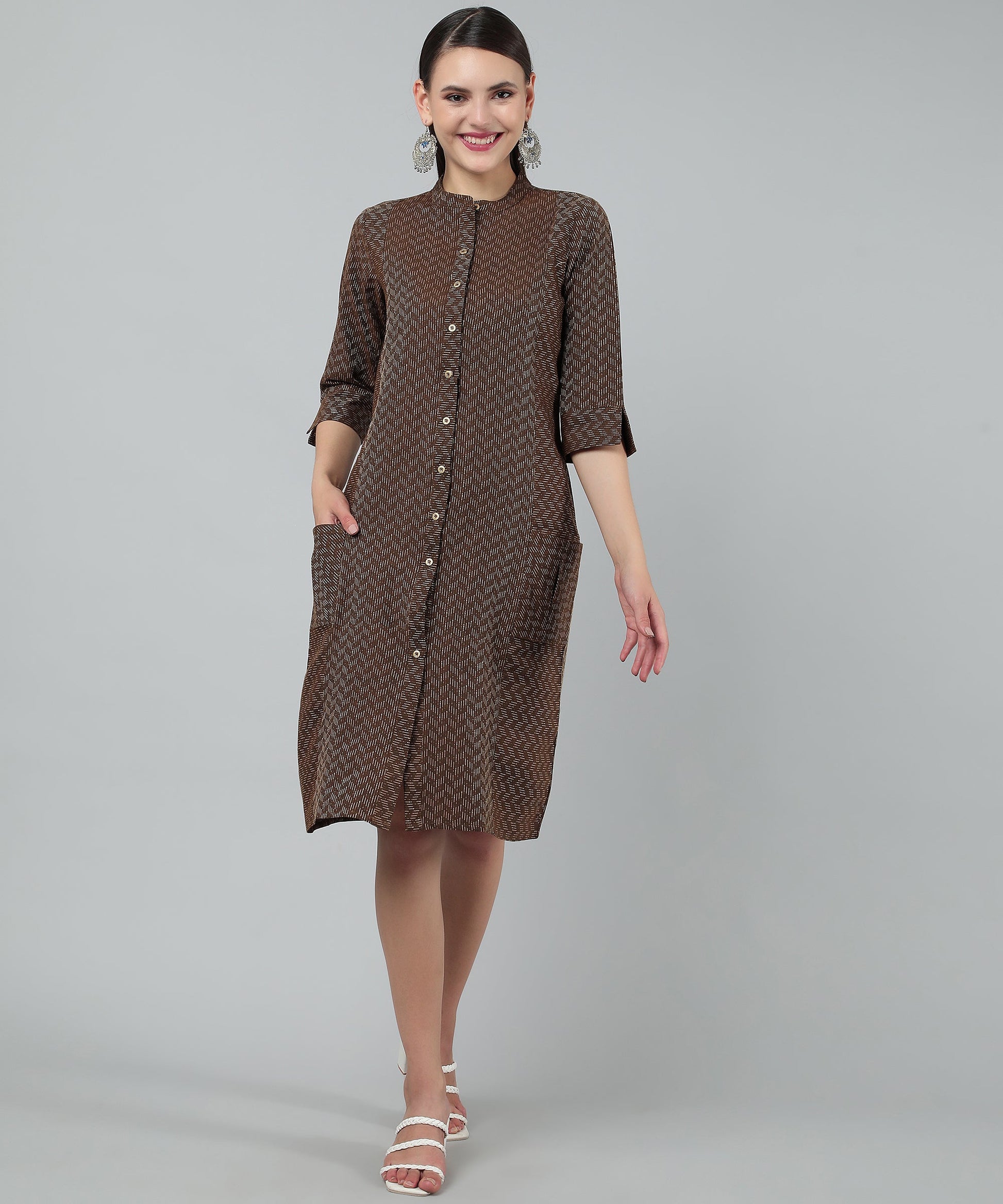 Self Weaved A-line Dress for Women Open Button Design, Brown