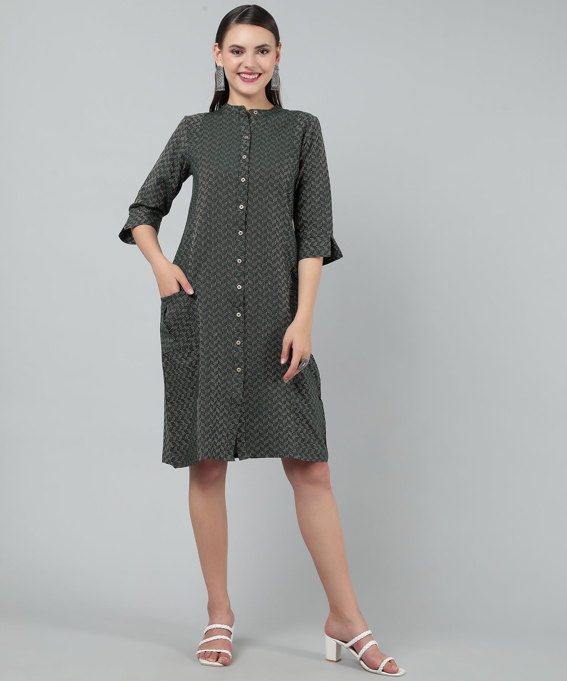 Self Weaved A-line Dress for Women Open Button Design,Green