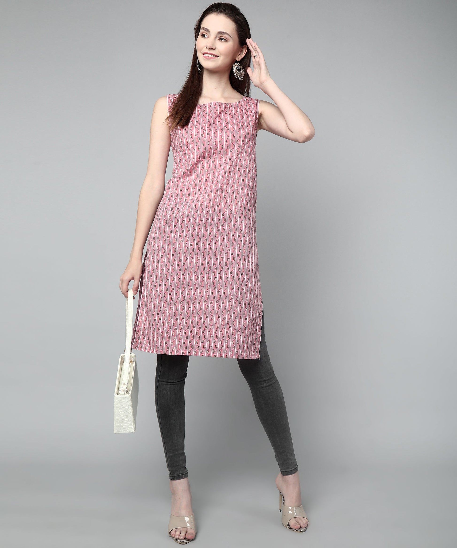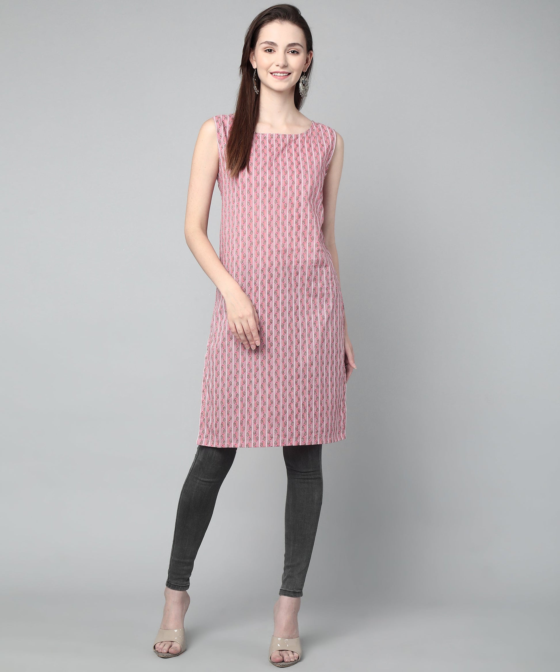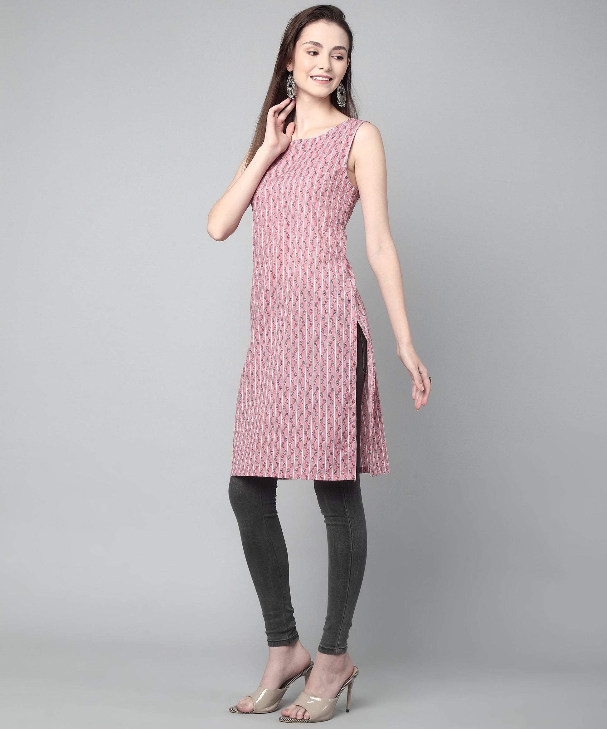 Sleeveless Striped Printed Cotton Kurta, Pink
