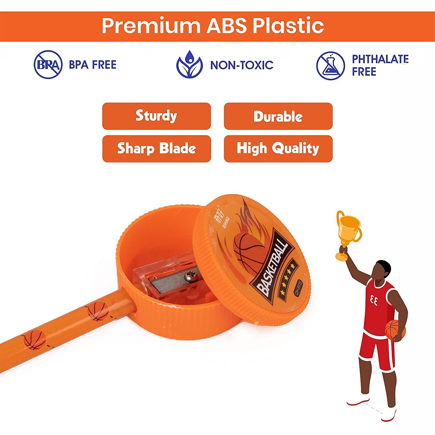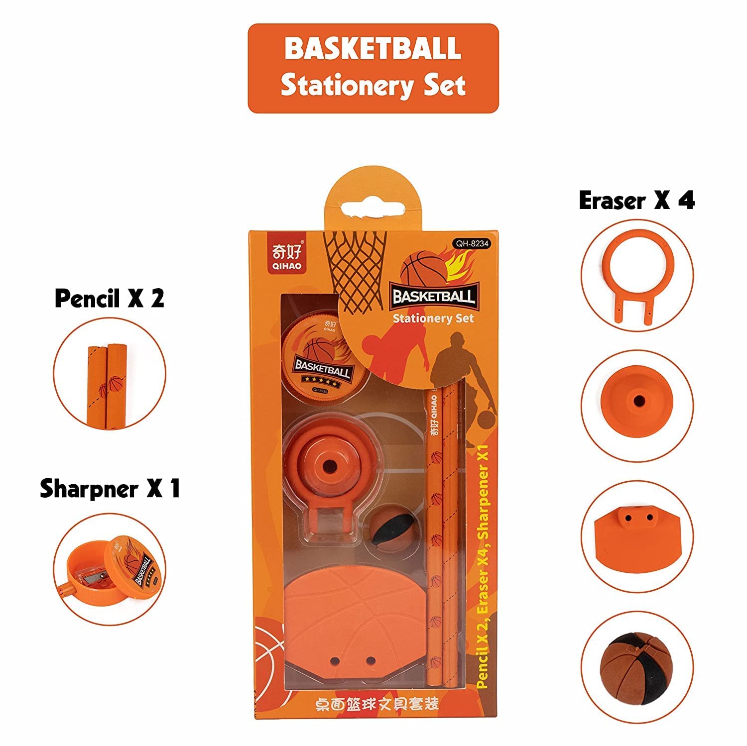 In The Box –Basketball pencils set comes with 2 X pencils, 4 X Erasers,1 X Sharpener Beautiful pencil set for kids of their favorite Basketball with eraser and sharpener As clearly seen material, and every age group can easily use them Best Gift: This Basketball themed stationary kit is the best gift options for children, School prize, birthday gifts.