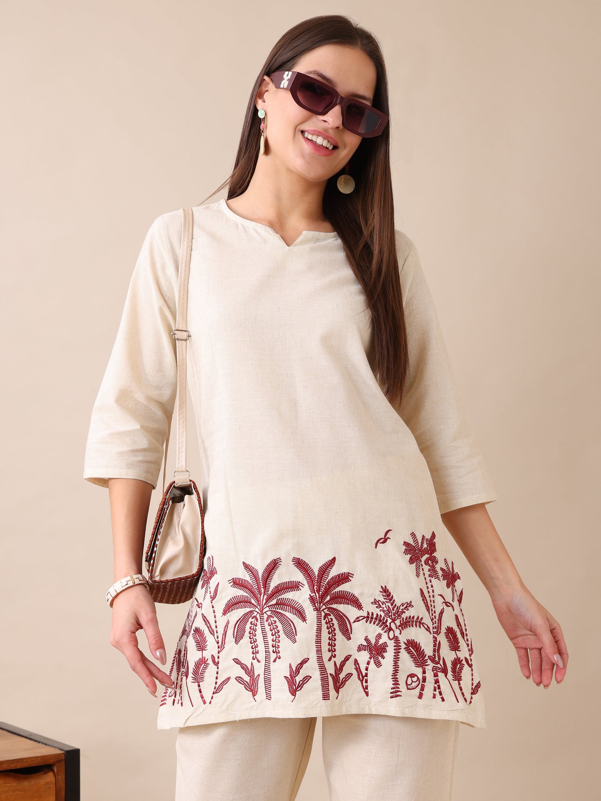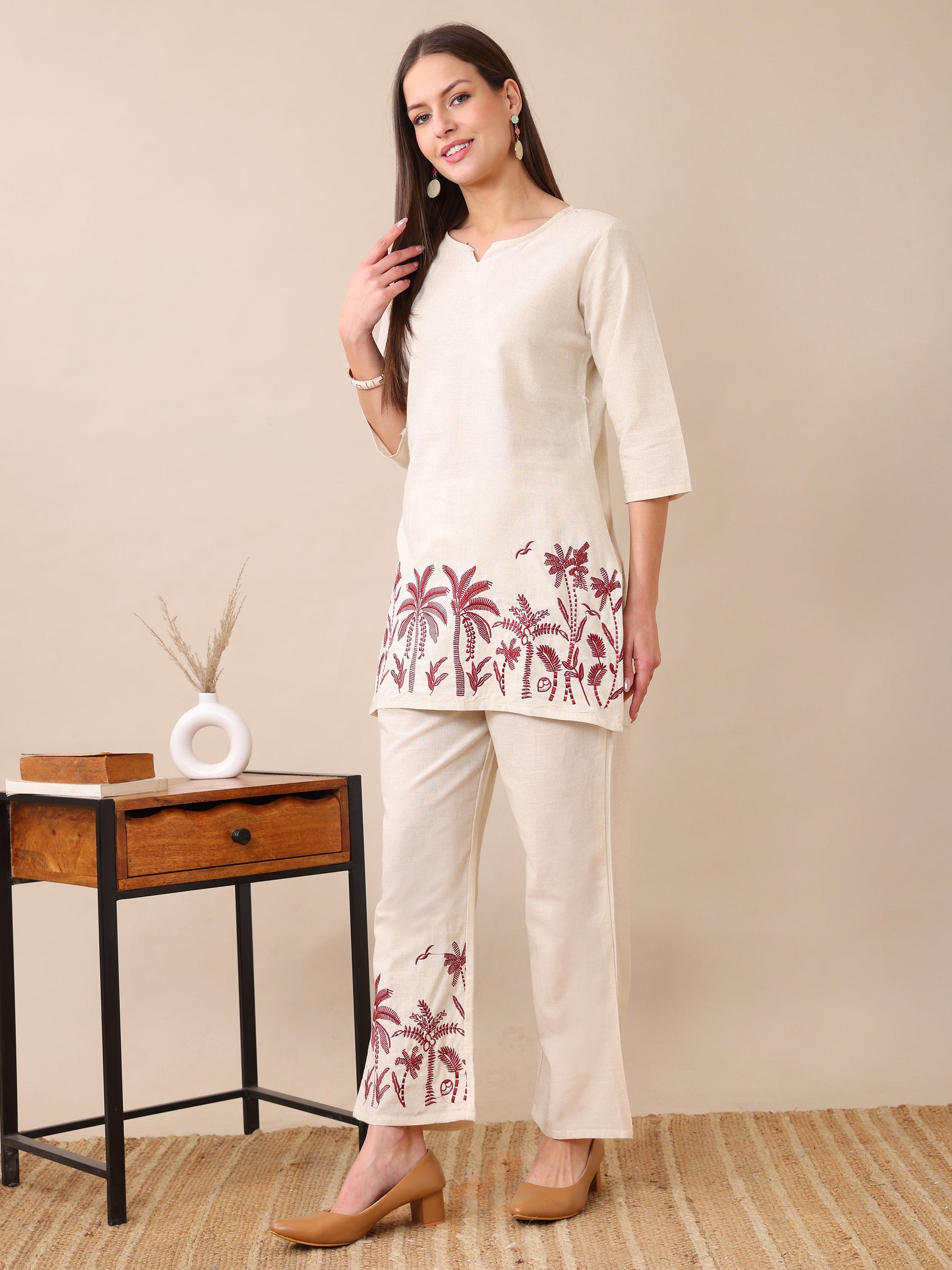 Women's Cotton Co-ord Set | Embroidery Kurta & Wide-Leg Pants | Stylish Ethnic Wear for Women | Casual & Festive Outfit | Summer Wear | Comfortable & Breathable Fabric(Maroon)